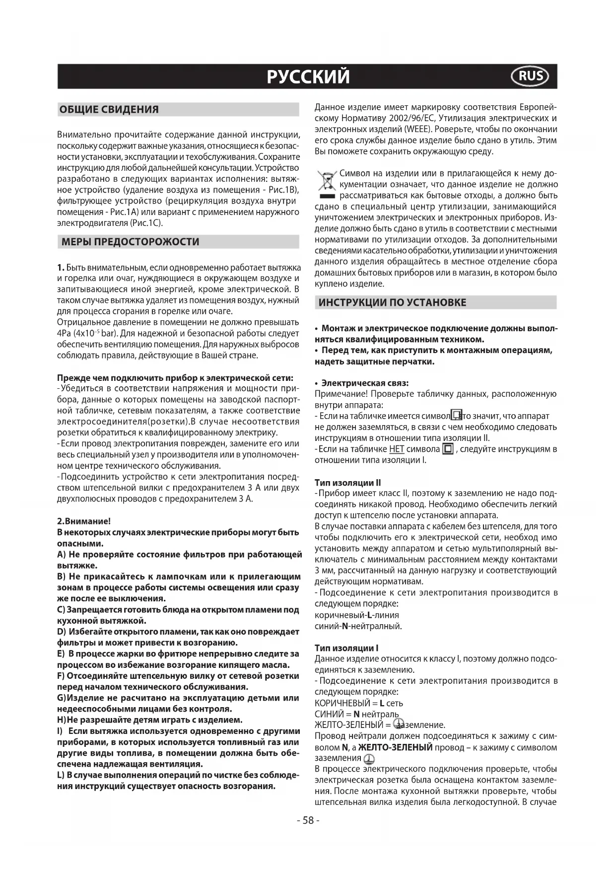приборами, в которых используется топливный газ или другие виды топлива, в помещении должна быть обе- спечена надлежащая вентиляция. L) В случае выполнения операций по чистке без соблюде- ния инструкций существует опасность возгорания. Данное изделие имеет маркировку соответствия Европей- скому Нормативу 2002/96/ЕС, Утилизация электрических и электронных изделий (WEEE). Роверьте, чтобы по окончании его срока службы данное изделие было сдано в утиль. Этим Вы поможете сохранить окружающую среду. Символ на изделии или в прилагающейся к нему до- кументации означает, что данное изделие не должно рассматриваться как бытовые отходы, а должно быть сдано в специальный центр утилизации, занимающийся уничтожением электрических и электронных приборов. Из- делие должно быть сдано в утиль в соответствии с местными нормативами по утилизации отходов. За дополнительными сведениями касательно обработки, утилизации и уничтожения данного изделия обращайтесь в местное отделение сбора домашних бытовых приборов или в магазин, в котором было куплено изделие. ИНСТРУКЦИИ ПО УСТАНОВКЕ