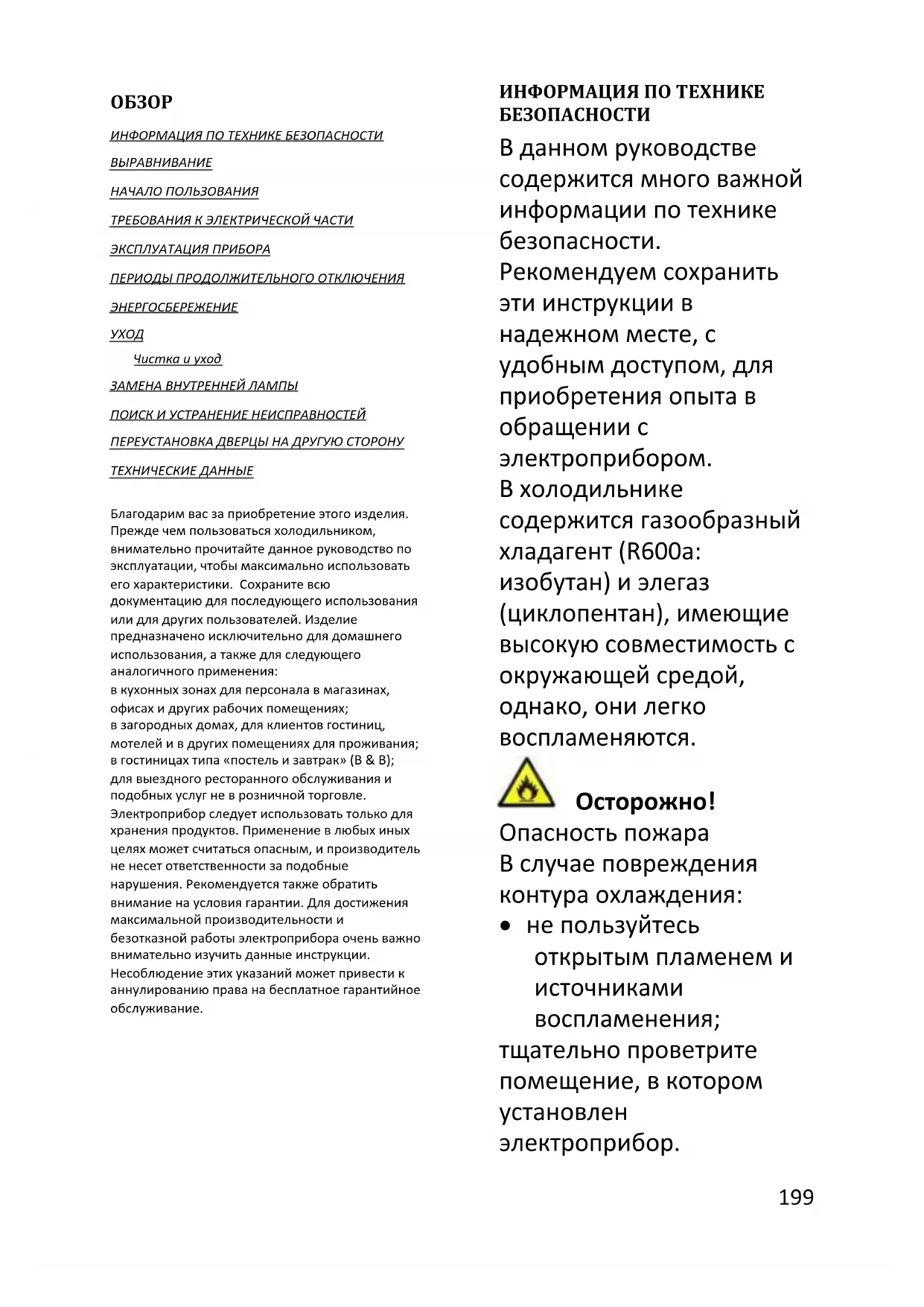ИНФОРМАЦИЯ ПО ТЕХНИКЕ БЕЗОПАСНОСТИ ВЫРАВНИВАНИЕ НАЧАЛО ПОЛЬЗОВАНИЯ ТРЕБОВАНИЯ К ЭЛЕКТРИЧЕСКОЙ ЧАСТИ ЭКСПЛУАТАЦИЯ ПРИБОРА ПЕРИОДЫ ПРОДОЛЖИТЕЛЬНОГО ОТКЛЮЧЕНИЯ ЭНЕРГОСБЕРЕЖЕНИЕ УХОД Чистка и уход ЗАМЕНА ВНУТРЕННЕЙ ЛАМПЫ ПОИСК И УСТРАНЕНИЕ НЕИСПРАВНОСТЕЙ ПЕРЕУСТАНОВКА ДВЕРЦЫ НА ДРУГУЮ СТОРОНУ ТЕХНИЧЕСКИЕ ДАННЫЕ Благодарим вас за приобретение этого изделия. Прежде чем пользоваться холодильником, внимательно прочитайте данное руководство по эксплуатации, чтобы максимально использовать его характеристики. Сохраните всю документацию для последующего использования или для других пользователей. Изделие предназначено исключительно для домашнего использования, а также для следующего аналогичного применения: в кухонных зонах для персонала в магазинах, офисах и других рабочих помещениях; в загородных домах, для клиентов гостиниц, мотелей и в других помещениях для проживания; в гостиницах типа «постель и завтрак» (B & B); для выездного ресторанного обслуживания и подобных услуг не в розничной торговле. Электроприбор следует использовать только для хранения продуктов. Применение в любых иных целях может считаться опасным, и производитель не несет ответственности за подобные нарушения. Рекомендуется также обратить внимание на условия гарантии. Для достижения максимальной производительности и безотказной работы электроприбора очень важно внимательно изучить данные инструкции. Несоблюдение этих указаний может привести к аннулированию права на бесплатное гарантийное обслуживание. ИНФОРМАЦИЯ ПО ТЕХНИКЕ БЕЗОПАСНОСТИ В данном руководстве содержится много важной информации по технике безопасности. Рекомендуем сохранить эти инструкции в надежном месте, с удобным доступом, для приобретения опыта в обращении с электроприбором. В холодильнике содержится газообразный хладагент (R600a: изобутан) и элегаз (циклопентан), имеющие высокую совместимость с окружающей средой, однако, они легко воспламеняются.
