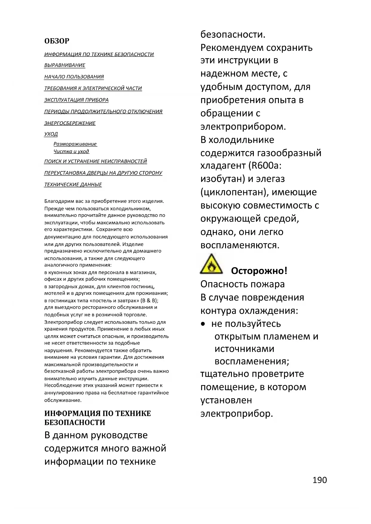 ИНФОРМАЦИЯ ПО ТЕХНИКЕ БЕЗОПАСНОСТИ ВЫРАВНИВАНИЕ НАЧАЛО ПОЛЬЗОВАНИЯ ТРЕБОВАНИЯ К ЭЛЕКТРИЧЕСКОЙ ЧАСТИ ЭКСПЛУАТАЦИЯ ПРИБОРА ПЕРИОДЫ ПРОДОЛЖИТЕЛЬНОГО ОТКЛЮЧЕНИЯ ЭНЕРГОСБЕРЕЖЕНИЕ УХОД Размораживание Чистка и уход ПОИСК И УСТРАНЕНИЕ НЕИСПРАВНОСТЕЙ ПЕРЕУСТАНОВКА ДВЕРЦЫ НА ДРУГУЮ СТОРОНУ ТЕХНИЧЕСКИЕ ДАННЫЕ Благодарим вас за приобретение этого изделия. Прежде чем пользоваться холодильником, внимательно прочитайте данное руководство по эксплуатации, чтобы максимально использовать его характеристики. Сохраните всю документацию для последующего использования или для других пользователей. Изделие предназначено исключительно для домашнего использования, а также для следующего аналогичного применения: в кухонных зонах для персонала в магазинах, офисах и других рабочих помещениях; в загородных домах, для клиентов гостиниц, мотелей и в других помещениях для проживания; в гостиницах типа «постель и завтрак» (B & B); для выездного ресторанного обслуживания и подобных услуг не в розничной торговле. Электроприбор следует использовать только для хранения продуктов. Применение в любых иных целях может считаться опасным, и производитель не несет ответственности за подобные нарушения. Рекомендуется также обратить внимание на условия гарантии. Для достижения максимальной производительности и безотказной работы электроприбора очень важно внимательно изучить данные инструкции. Несоблюдение этих указаний может привести к аннулированию права на бесплатное гарантийное обслуживание. ИНФОРМАЦИЯ ПО ТЕХНИКЕ БЕЗОПАСНОСТИ В данном руководстве содержится много важной информации по технике безопасности. Рекомендуем сохранить эти инструкции в надежном месте, с удобным доступом, для приобретения опыта в обращении с электроприбором. В холодильнике содержится газообразный хладагент (R600a: изобутан) и элегаз (циклопентан), имеющие высокую совместимость с окружающей средой, однако, они легко воспламеняются.