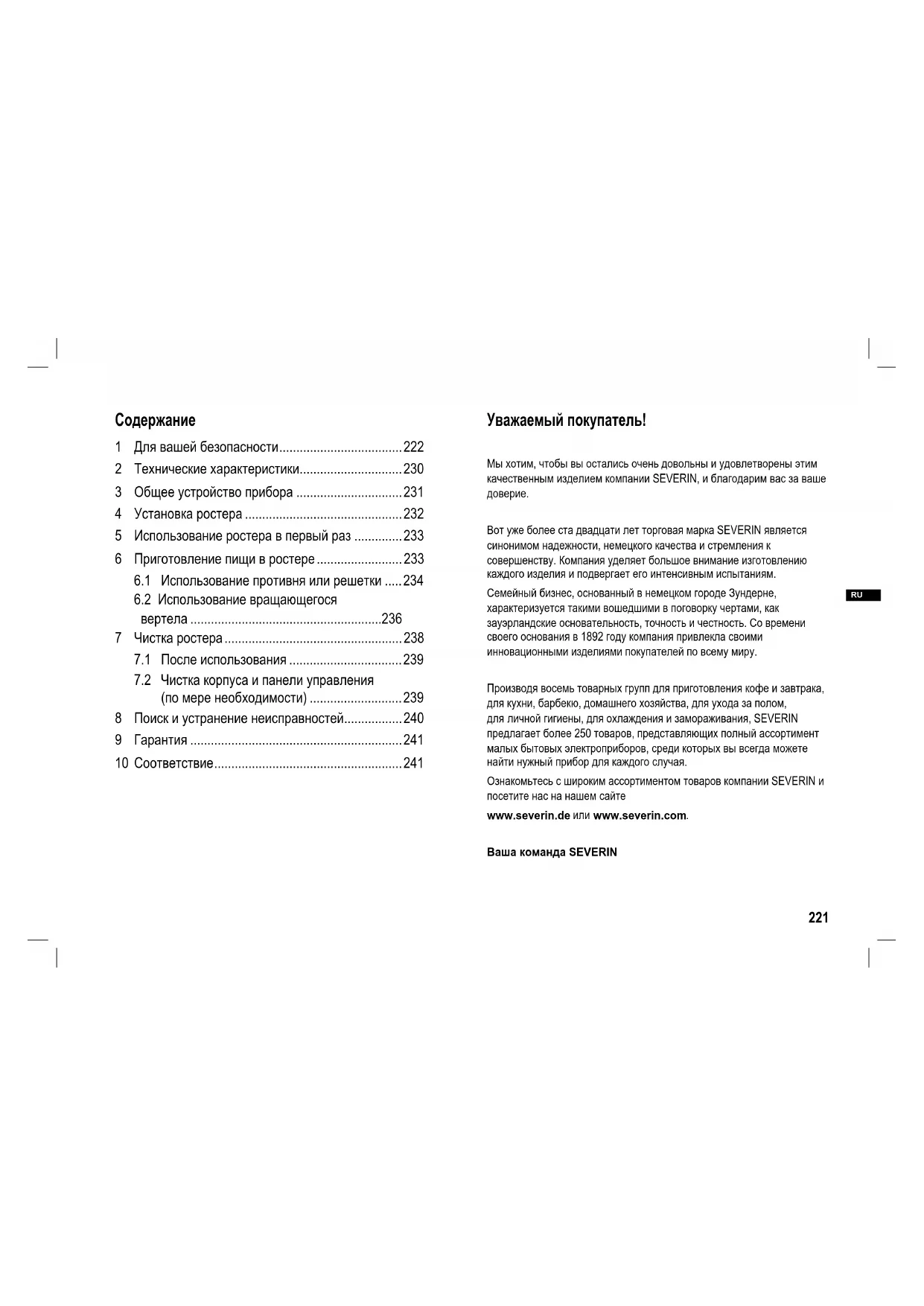 ПОЛЕЗНЫЙ СОВЕТ: – Если способы устранения, предложенные в таблице, не приводят к удовлетворительному результату, и неисправность сохраняется, свяжитесь с нашей Службой сервисного обслуживания. – Если вам потребуются запасные части или принадлежности для вашего прибора, посетите, пожалуйста, наш онлайн-магазин в разделе 'Service /Ersatzteil-Shop' на нашем сайте www.severin.de. Принадлежности и запасные части Для вашего удобства запасные части или принадлежности можно заказать по интернету на нашей домашней странице http://www.severin. de, в разделе 'Service /Ersatzteil-Shop'. Утилизация ростера Устройства, помеченные этим символом, должны утилизироваться отдельно от домашнего мусора, так как они содержат полезные материалы, которые могут быть направлены на переработку. Правильная утилизация обеспечивает защиту окружающей среды и здоровья человека. Информацию по этому вопросу вы можете получить у местных властей или у продавца устройства. 9 Гарантия Гарантийный срок на приборы фирмы „Severin“ - 2 годa со дня иx продажи. В течение этого времени мы бесплатно устраним все дефекты, возникшие в результате производственного брака или применения некачественных материалов. Гарантия не распространяется на дефекты, возникшие из-за несоблюдения руководства по эксплуатации, грубого обращения с прибором, а также на бьющиеся (стеклянные и керамические) части. Данная гарантия не нарушает ваших законных прав, а также любых других прав потребителя, установленных национальным законодательством, регулирующим отношения, возникающие между потребителями и продавцами при продаже товаров. Гарантия аннулируется, если прибор ремонтировался не в указанных нами пунктах сервисного обслуживания. Вы можете по почте отправить прибор с перечнем неисправностей и приложенным кассовым чеком на наш ближайший пункт сервисного обслуживания. Какие-либо дополнительные гарантии продавца заводом-изготовителем не принимаются. 10 Соответствие Данное изделие соответствует всем требованиям директив ЕС, необходимым для нанесения СЕ маркировки.242 Kundendienstzentralen Service Centres Centrales service-après-vente Oficinas centrales del servicio Centros de serviço Centrale del servizio clienti Service-centrales Centrale serviceafdelinger Centrala kundtjänstplatser Keskushuollot Servisné stredisko Centrala obsługi klientów Szerviz Κεντρικό σέρβις SEVERIN Service Röhre 27 59846 Sundern Telefon (02933) 982-460 Telefax (02933) 982-480 service@severin.de Kundendienst Ausland Austria Degupa Vertriebsgesellschaft m.b.H. Gewerbeparkstr. 7 5081 Anif / Salzburg Tel.: +43 (0) 62 46 73 58 10 Fax:. +43 (0) 62 46 / 72 70 2 eMail: degupa@silva-schneider.at Belgique BVBA Dancal Elektro Kalkhoevestraat 1 B-8790 Waregem Tel.: +32 56 71 54 51 Fax: +32 56 70 04 49 Bosnia i Herzegovina Malisic export-import d.o.o Biletic polje 88260 Citluk Tel: +387 36 650 601 Fax: +387 36 651 062 Bulgaria Noviz AG Khan Kubrat 1 Str. BG-4000 Plovdiv Tel.: + 359 32 275 617, 275 614 eMail: sales@noviz.com China Sunnex Century Catering Equipment (Shenzhen) Ltd. 2/F., Block A, Dong He Industrial Building Yue He Street, Sha Shen Road, Sha Tou Jiao Shenzhen Tel.: +86 755 25551458 or 25550852 Fax: +86 755 25357468 or 25357498 eMail: sales@severinchina.com Web: http://www.severinchina.com Czech Republic BVZ Commerce s.r.o. Parkerova c.p. 618 CZ 25067 Klecany Tel.: +420 233 55 94 74 Fax: +420 233 55 94 74 Danmark F&H of Scandinavia A/S Gl. Skivevej 70 DK-8800 Viborg Tel.: +45 8928 1300 Fax: +45 8928 1301 eMail: info@fh-as.dk Estonia: Tallinn: CENTRALSERVICE, Tammsaare tee 134B, tel: 654 3000 Espana Severin Electrodomesticos España S.L. S/N. CC. ‘Las Higueras’ Plaza Miguel de Cervantes 45217 UGENA Tel: +34 925 51 34 05 Fax: +34 925 54 19 40 eMail: severin@severin.es Web: http://www.severin.es Espana – Islas Canarias Comercial Alte S.L. C/Subida al Mayorazgo, 14 38110 Santa Cruz de Tenerife Tel: +34 922 20 58 00 Fax: +34 922 20 59 00 eMail: comalte@telefonica.net Finland AV-Komponentti Oy Koronakatu 1 A 02210 Espoo Tel.: +358 9 867 8020 Fax: +358 9 867 80250 Web: www.avkomponentti. France SEVERIN France Sarl 4, rue de Thal CS 38