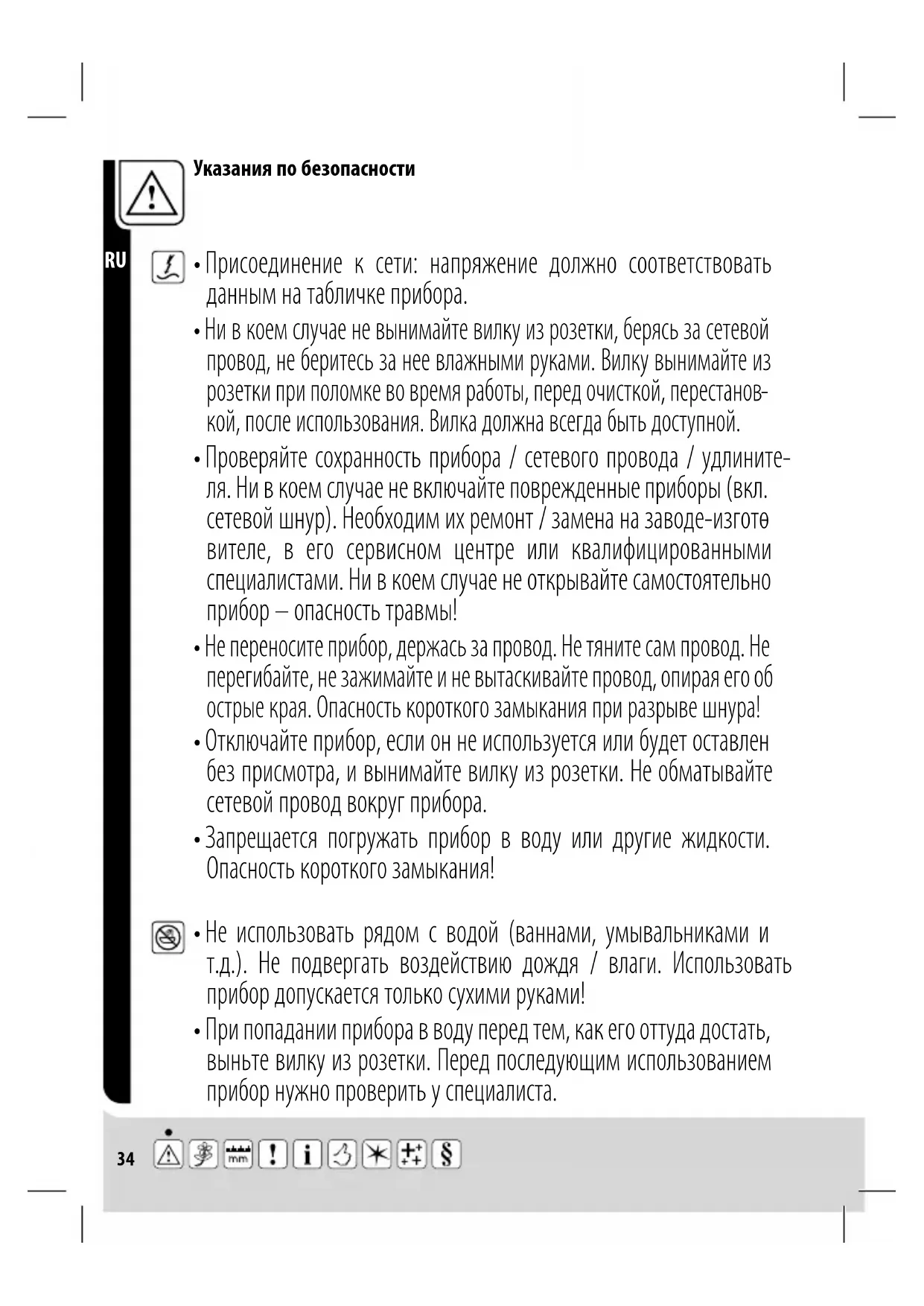 - Не использовать рядом с водой (ваннами, умывальниками и т.д.). Не подвергать воздействию дождя / влаги. Использовать прибор допускается только сухими руками!35 Указания по безопасности