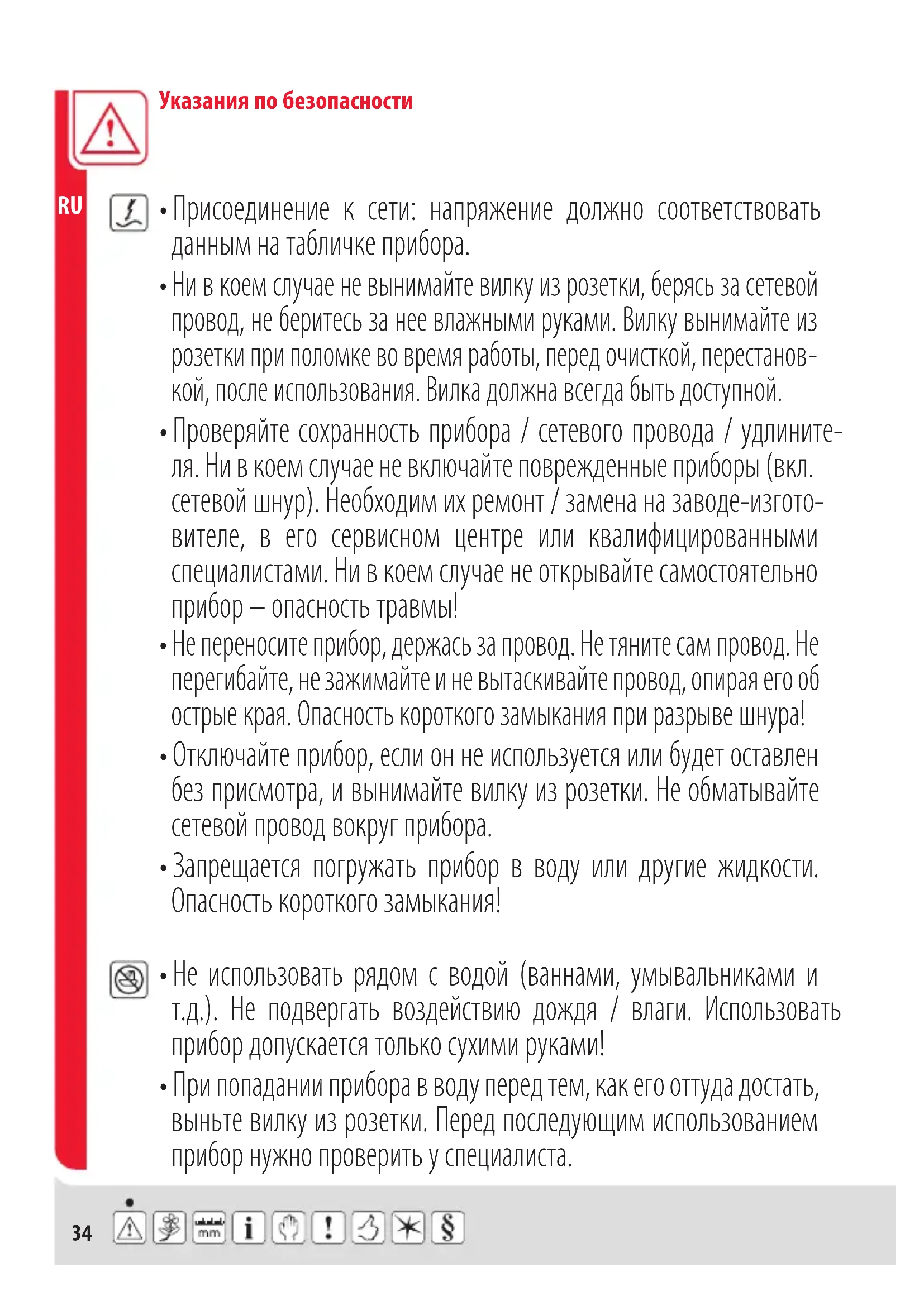 - При попадании прибора в воду перед тем, как его оттуда достать, выньте вилку из розетки. Перед последующим использованием прибор нужно проверить у специалиста.