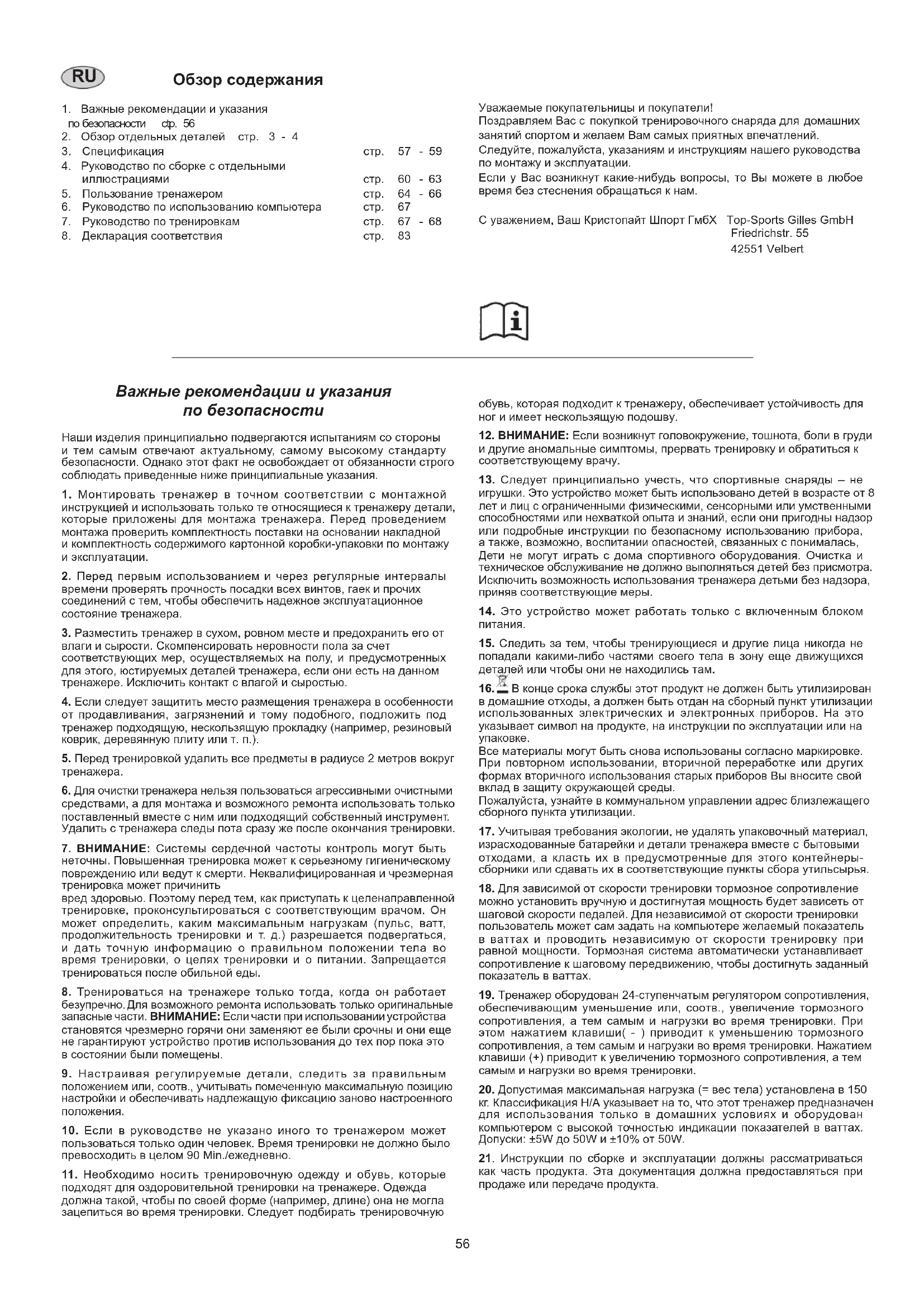 8 . Д е к л а р а ц и я с о о т в е т с т в и я с т р . 8 3 Уважаемые покупательницы и покупатели! Поздравляем Вас с покупкой тренировочного снаряда для домашних занятий спортом и желаем Вам самых приятных впечатлений. Следуйте, пожалуйста, указаниям и инструкциям нашего руководства по монтажу и эксплуатации. Если у Вас возникнут какие-нибудь вопросы, то Вы можете в любое время без стеснения обращаться к нам. С уважением, Ваш Кристопайт Шпорт ГмбХ Top-Sports Gilles GmbH Friedrichstr. 55 42551 Velbert Важные рекомендации и указания по безопасности Наши изделия принципиально подвергаются испытаниям со стороны и тем самым отвечают актуальному, самому высокому стандарту безопасности. Однако этот факт не освобождает от обязанности строго соблюдать приведенные ниже принципиальные указания.