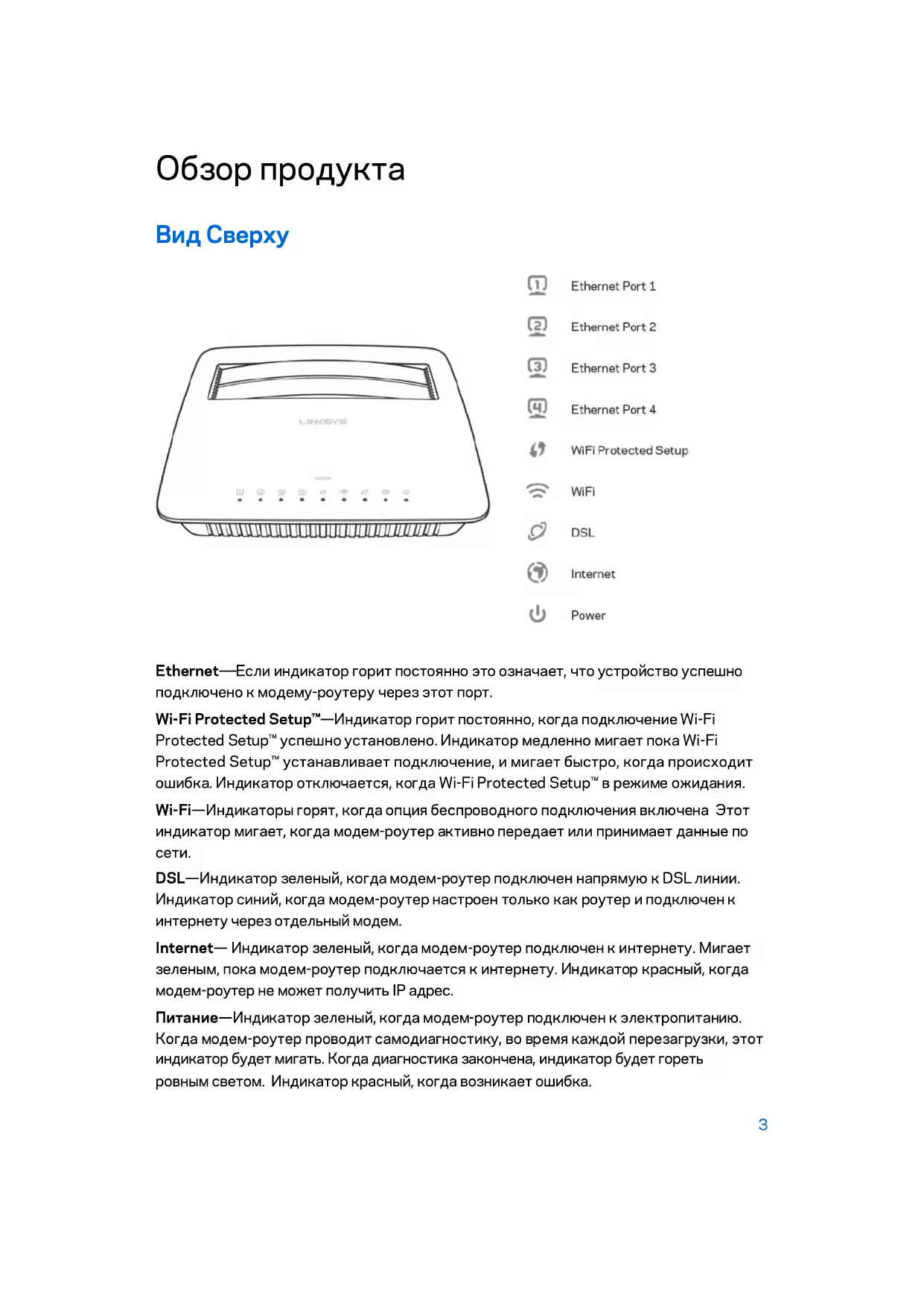 Reset (Сброс), Wi-Fi Protected Setup, питание Светодиодные индикаторы Ethernet, Wi-Fi Protected Setup™, Wi-Fi, DSL, Интернет, Питание UPnP Поддерживается Безопасность