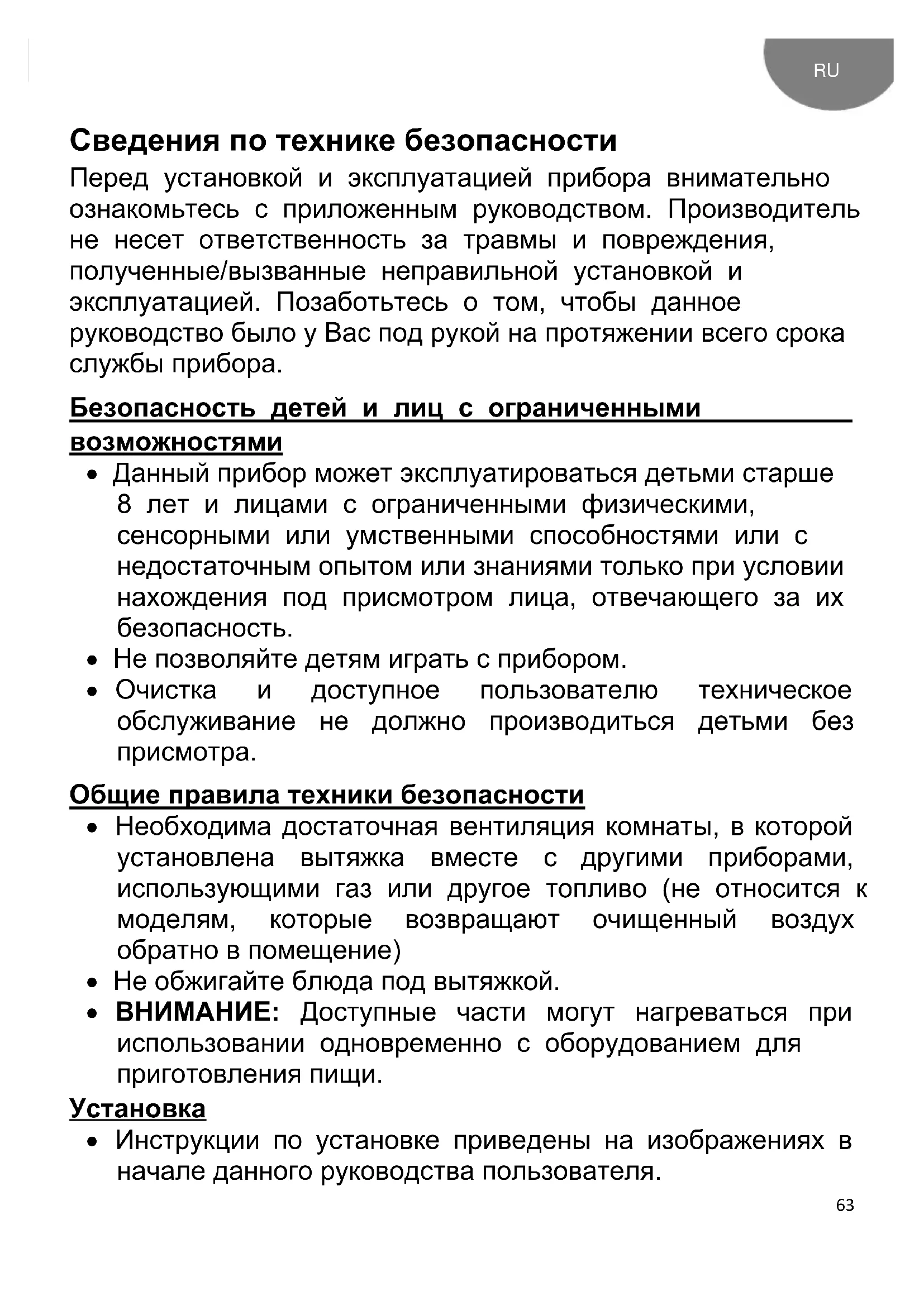 Сведения по технике безопасности Перед установкой и эксплуатацией прибора внимательно ознакомьтесь с приложенным руководством. Производитель не несет ответственность за травмы и повреждения, полученные/вызванные неправильной установкой и эксплуатацией. Позаботьтесь о том, чтобы данное руководство было у Вас под рукой на протяжении всего срока службы прибора. Безопасность детей и лиц с ограниченными возможностями