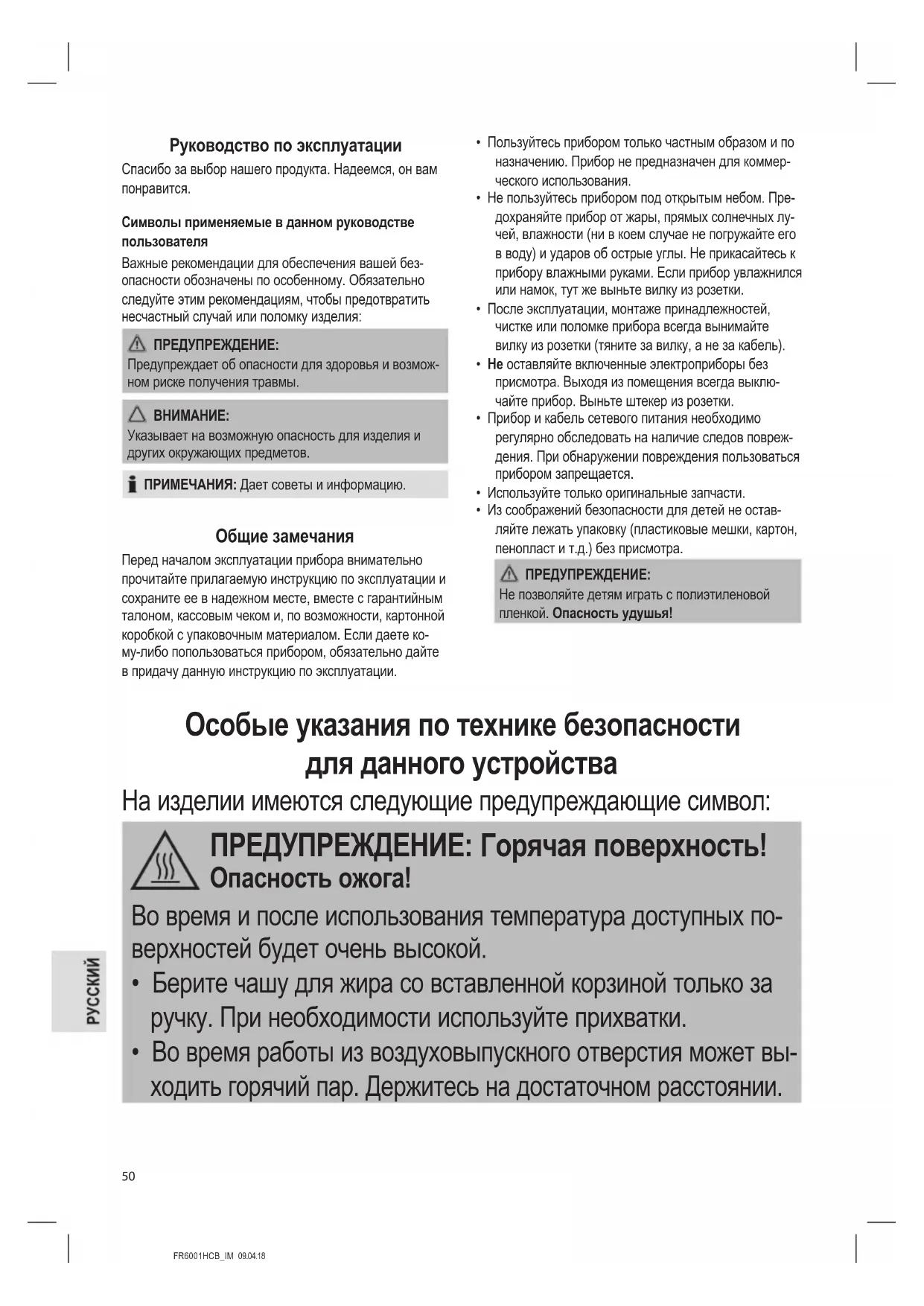 - Во время чистки прибор нельзя погружать в воду. Необходимо соблюдать инструкции, приведенные в разделе «Чистка».FR6001HCB_IM 09.04.18