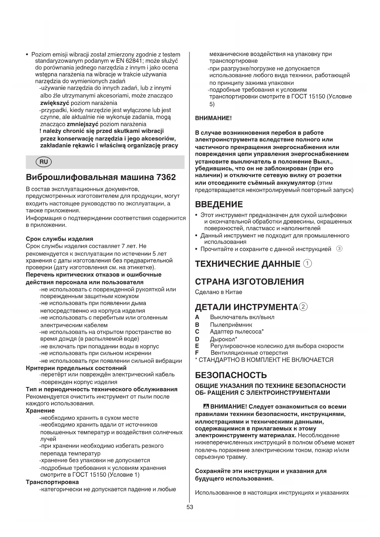 Виброшлифовальная машина 7362 В состав эксплуатационных документов, предусмотренных изготовителем для продукции, могут входить настоящее руководство по эксплуатации, а также приложения. Информация о подтверждении соответствия содержится в приложении. Срок службы изделия Срок службы изделия составляет 7 лет. Не рекомендуется к эксплуатации по истечении 5 лет хранения с даты изготовления без предварительной проверки (дату изготовления см. на этикетке). Перечень критических отказов и ошибочные действия персонала или пользователя - не использовать с поврежденной рукояткой или поврежденным защитным кожухом - не использовать при появлении дыма непосредственно из корпуса изделия - не использовать с перебитым или оголенным электрическим кабелем - не использовать на открытом пространстве во время дождя (в распыляемой воде) - не включать при попадании воды в корпус - не использовать при сильном искрении - не использовать при появлении сильной вибрации Критерии предельных состояний - перетёрт или повреждён электрический кабель - поврежден корпус изделия Тип и периодичность технического обслуживания Рекомендуется очистить инструмент от пыли после каждого использования.