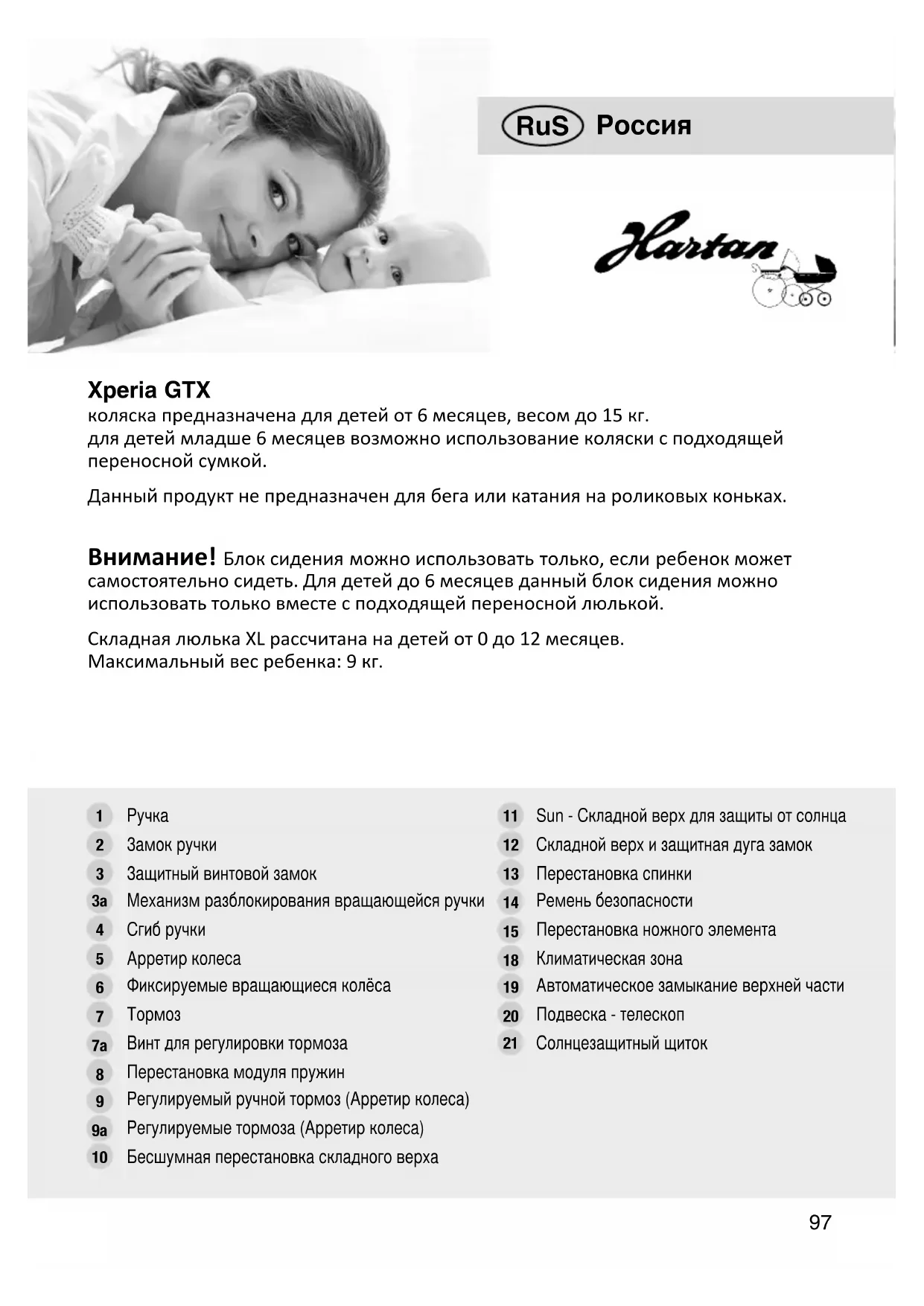 îññèÿ RuS Xperia GTX коляска предназначена для детей от 6 месяцев, весом до 15 кг. для детей младше 6 месяцев возможно использование коляски с подходящей переносной сумкой. Данный продукт не предназначен для бега или катания на роликовых коньках. Рó÷êà Çàìîê ðó÷êè Çàùèòíûé âèíòîâîé çàìîê Механизм разблокирования вращающейся ручки Сãèá ðó÷êè Àððåòèð êîëåñà Ôèêñèðóåìûå âðàùàþùèåcÿ êîë¸ñà Òîðìîç Винт для регулировки тормоза Ïåðåñòàíîâêà ìîäóëÿ ïðóæèí Рåãóëèðóåìûé ðó÷íîé òîðìîç (Арретир колеса) Рåãóëèðóåìûå òîðìîçà (Арретир колеса) Áåñøóìíàÿ ïåðåñòàíîâêà ñêëàäíîãî âåðõà Sun - Сêëàäíîé âåðõ äëÿ çàùèòû îò ñîëíöà Сêëàäíîé âåðõ è çàùèòíàÿ äóãà çàìîê Ïåðåñòàíîâêà ñïèíêè Рåìåíü áåçîïàñíîñòè Ïåðåñòàíîâêà íîæíîãî ýëåìåíòà Климатическая зона Àâòîìàòè÷åñêîå çàìûêàíèå âåðõíåé ÷àñòè Подвеска - телескоп Солнцезащитный щиток