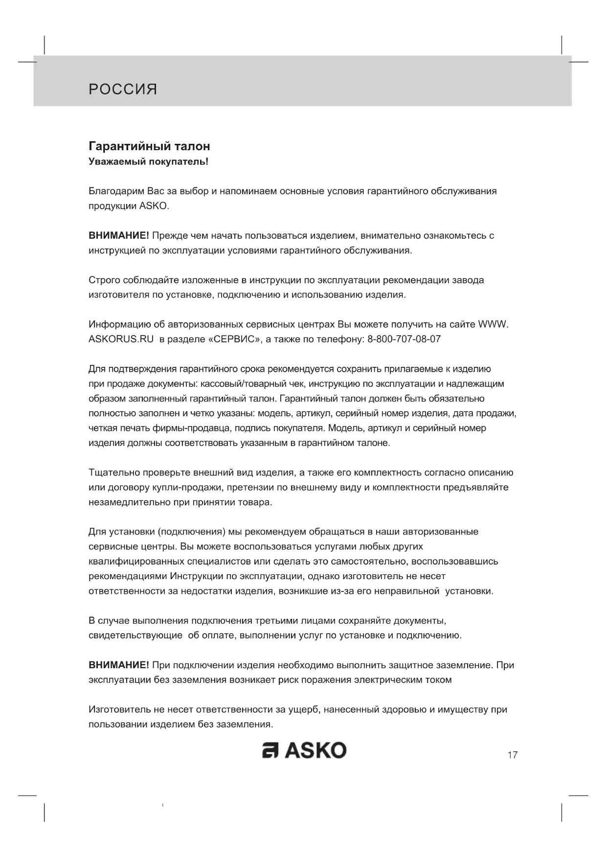 Гарантийный талон Уважаемый покупатель! Благодарим Вас за выбор и напоминаем основные условия гарантийного обслуживания продукции ASKO. ВНИМАНИЕ! Прежде чем начать пользоваться изделием, внимательно ознакомьтесь с инструкцией по эксплуатации условиями гарантийного обслуживания. Строго соблюдайте изложенные в инструкции по эксплуатации рекомендации завода изготовителя по установке, подключению и использованию изделия. Информацию об авторизованных сервисных центрах Вы можете получить на сайте WWW. ASKORUS.RU в разделе «СЕРВИС», а также по телефону: 8-800-707-08-07 Для подтверждения гарантийного срока рекомендуется сохранить прилагаемые к изделию при продаже документы: кассовый/товарный чек, инструкцию по эксплуатации и надлежащим образом заполненный гарантийный талон. Гарантийный талон должен быть обязательно полностью заполнен и четко указаны: модель, артикул, серийный номер изделия, дата продажи, четкая печать фирмы-продавца, подпись покупателя. Модель, артикул и серийный номер изделия должны соответствовать указанным в гарантийном талоне. Тщательно проверьте внешний вид изделия, а также его комплектность согласно описанию или договору купли-продажи, претензии по внешнему виду и комплектности предъявляйте незамедлительно при принятии товара. Для установки (подключения) мы рекомендуем обращаться в наши авторизованные сервисные центры. Вы можете воспользоваться услугами любых других квалифицированных специалистов или сделать это самостоятельно, воспользовавшись рекомендациями Инструкции по эксплуатации, однако изготовитель не несет ответственности за недостатки изделия, возникшие из-за его неправильной установки. В случае выполнения подключения третьими лицами сохраняйте документы, свидетельствующие об оплате, выполнении услуг по установке и подключению. ВНИМАНИЕ! При подключении изделия необходимо выполнить защитное заземление. При эксплуатации без заземления возникает риск поражения электрическим током Изготовитель не несет ответственности за ущерб, нанесенный здоровью и имуществу при пользовании изделием без заземления.18