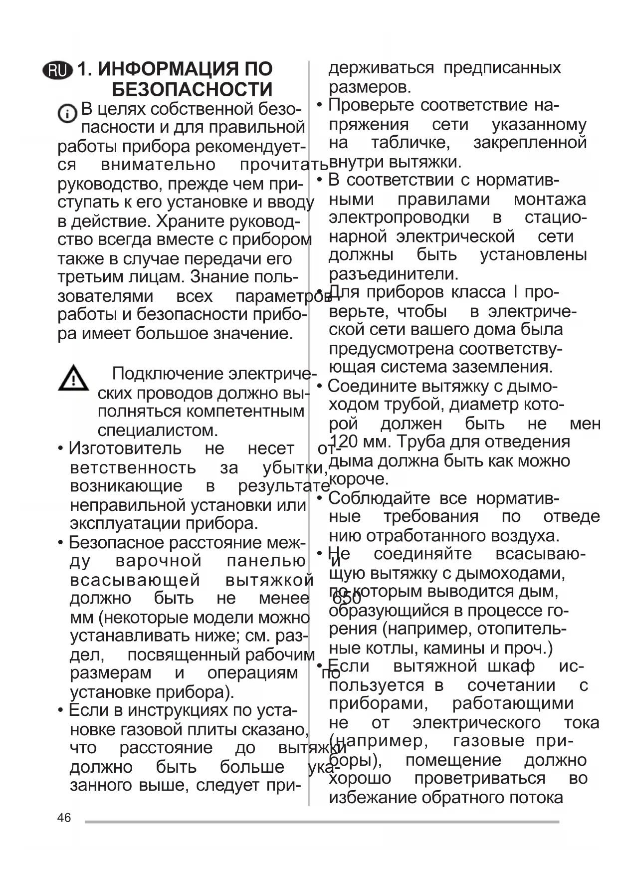 - Если вытяжной шкаф ис- пользуется в сочетании с приборами, работающими не от электрического тока (например, газовые при- боры), помещение должно хорошо проветриваться во избежаниеобратногопотока RU47 отходящихгазов.Приполь- зованиикухоннойвытяжкой в сочетании с приборами, работающиминеотэлектри- ческоготока,отрицательное давление в помещении не должнопревышать0,04мбар стем,чтобыдымневсасы- вался вытяжкой обратно в