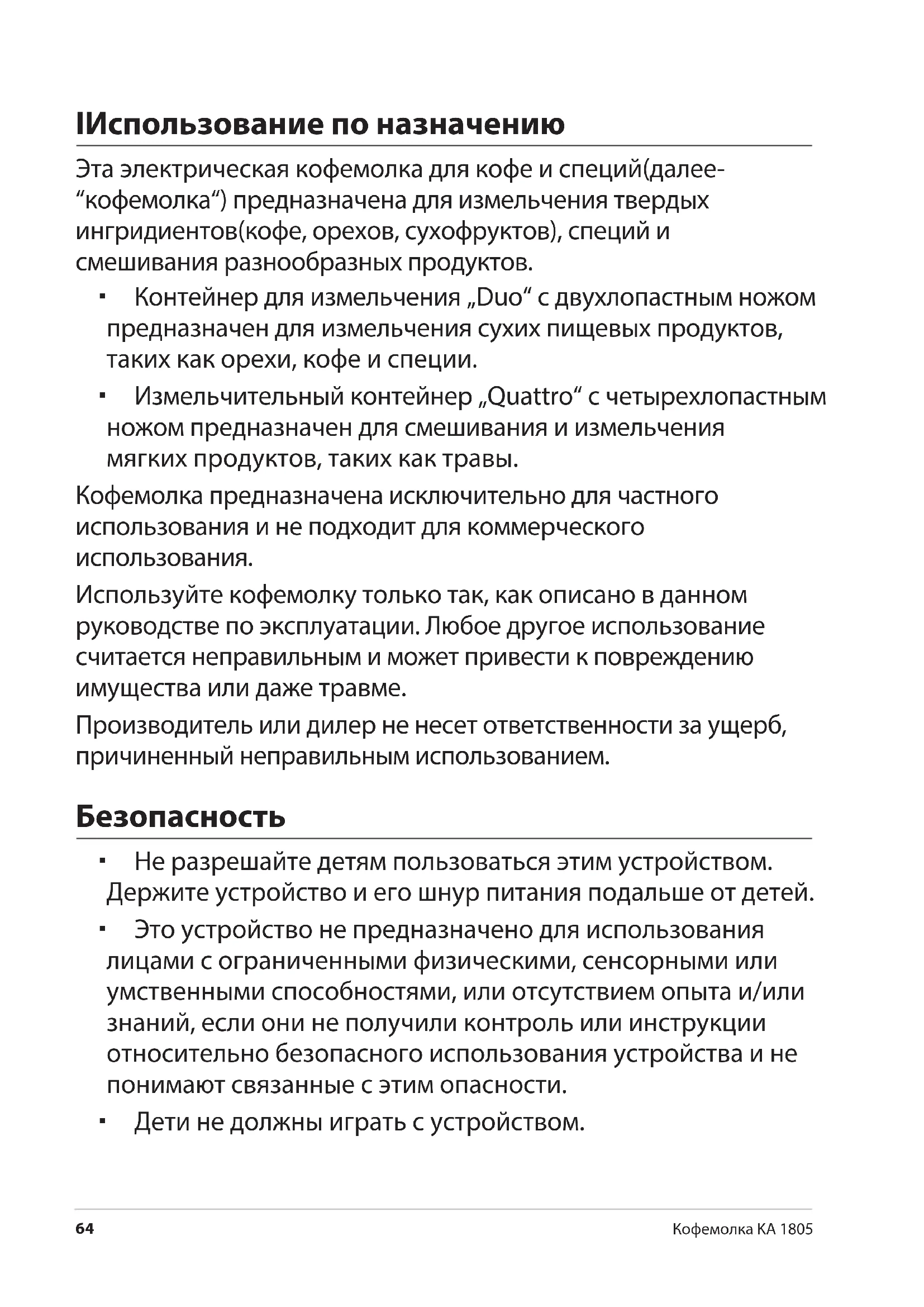 Используйте кофемолку только так, как описано в данном руководстве по эксплуатации. Любое другое использование считается неправильным и может привести к повреждению имущества или даже травме.