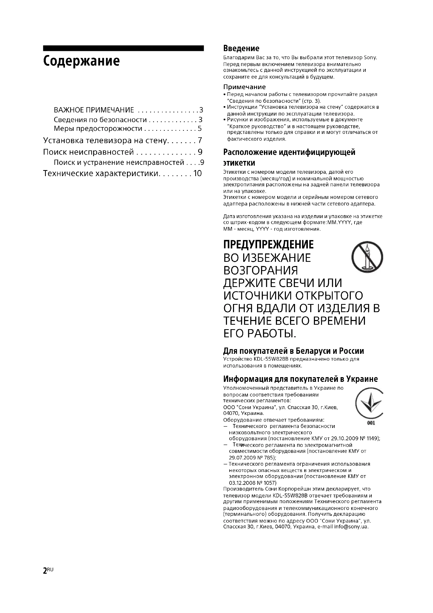 ДЕРЖИТЕ СВЕЧИ ИЛИ ИСТОЧНИКИ ОТКРЫТОГО ОГНЯ ВДАЛИ ОТ ИЗДЕЛИЯ В ТЕЧЕНИЕ ВСЕГО ВРЕМЕНИ ЕГО РАБОТЫ. Для покупателей в Беларуси и России Устройство KDL-55W828B предназначено только для использования в помещениях. Информация для покупателей в Украине Уполномоченный представитель в Украине по вопросам соответствия требованиям технических регламентов: ООО "Сони Украина", ул. Спасская 30, г.Киев, 070, Украина.Оборудование отвечает требованиям: Технического регламента безопасности низковольтного электрического оборудования (постановление КМУ от 29.10.2009 № 1149); Технического регламента по электромагнитной совместимости оборудования (постановление КМУ от 29.07.2009 № 785); Технического регламента ограничения использования некоторых опасных веществ в электрическом и электронном оборудовании (постановление КМУ от 03.12.2008 № 1057) Производитель Сони Корпорейшн этим декларирует, что телевизор модели KDL-55W828B отвечает требованиям и другим применимым положениям Технического регламента радиооборудования и телекоммуникационного конечного (терминального) оборудования. Получить декларацию соответствия можно по адресу ООО "Сони Украина", ул. Спасская 30, г.Киев, 04070, Украина, e-maіl іnfo@sony.ua.3