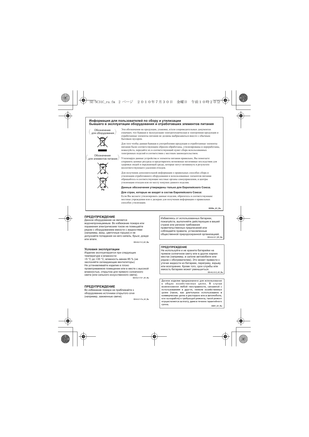 Избавляясь от использованных батареек, пожалуйста, выполняйте действующие в вашей стране или регионе требования правительственных предписаний или соблюдайте правила, установленные общественной природоохранной организацией. D3-4-2-3-1_B1_Ru
