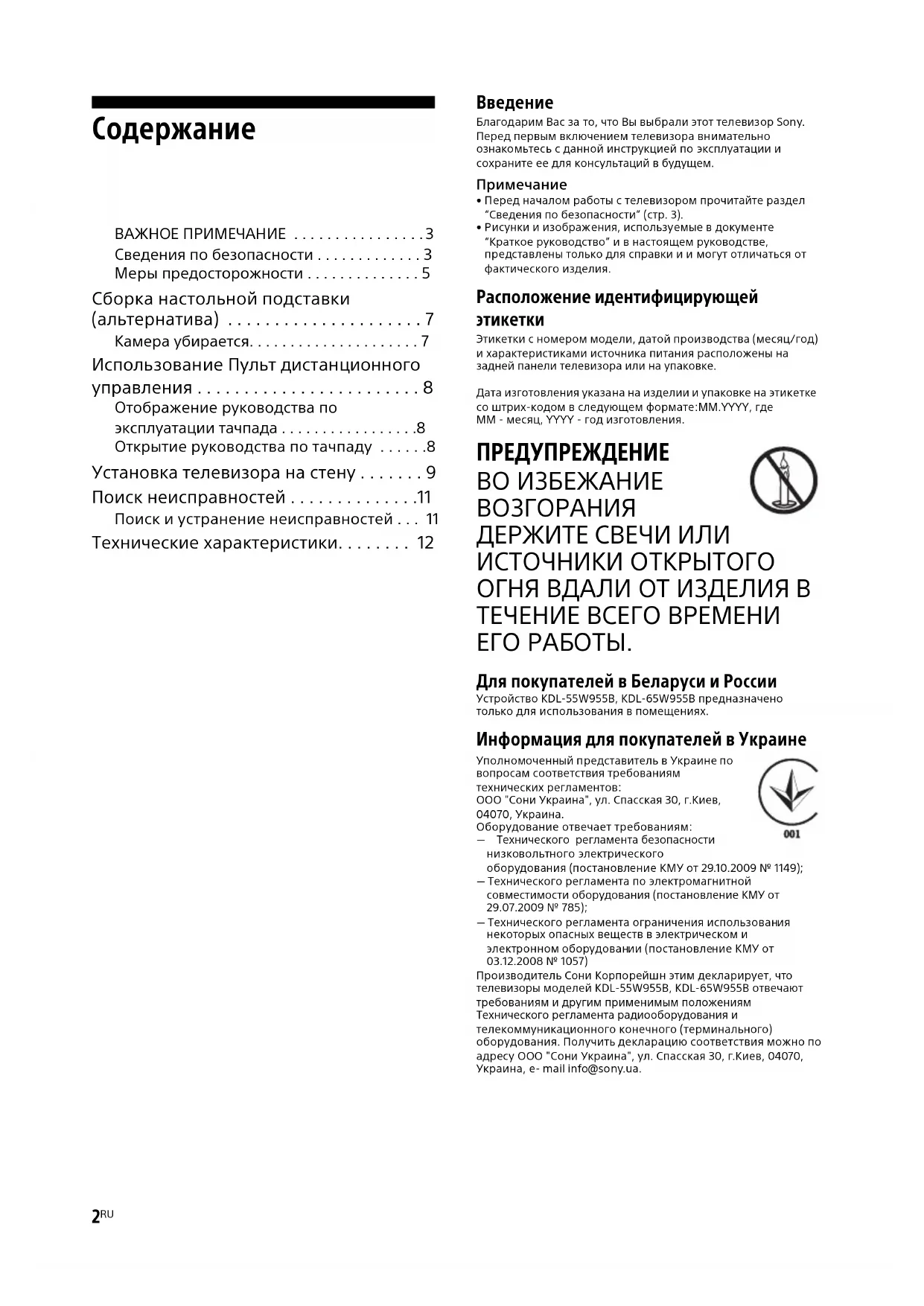 ДЕРЖИТЕ СВЕЧИ ИЛИ ИСТОЧНИКИ ОТКРЫТОГО ОГНЯ ВДАЛИ ОТ ИЗДЕЛИЯ В ТЕЧЕНИЕ ВСЕГО ВРЕМЕНИ ЕГО РАБОТЫ. Для покупателей в Беларуси и России Устройство KDL-55W955B, KDL-65W955B предназначено только для использования в помещениях. Информация для покупателей в Украине Уполномоченный представитель в Украине по вопросам соответствия требованиям технических регламентов: ООО "Сони Украина", ул. Спасская 30, г.Киев, 04070, Украина.Оборудование отвечает требованиям: Технического регламента безопасности низковольтного электрического оборудования (постановление КМУ от 29.10.2009 № 1149); Технического регламента по электромагнитной совместимости оборудования (постановление КМУ от 29.07.2009 № 785); Технического регламента ограничения использования некоторых опасных веществ в электрическом и электронном оборудовании (постановление КМУ от