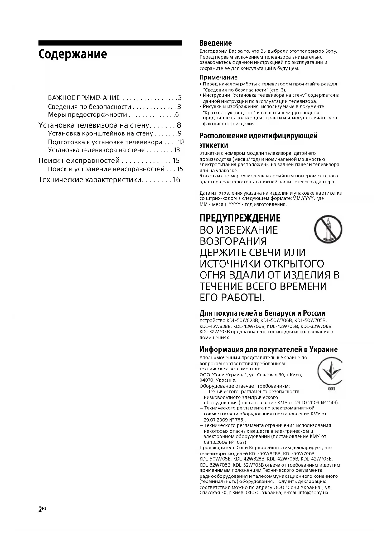 ДЕРЖИТЕ СВЕЧИ ИЛИ ИСТОЧНИКИ ОТКРЫТОГО ОГНЯ ВДАЛИ ОТ ИЗДЕЛИЯ В ТЕЧЕНИЕ ВСЕГО ВРЕМЕНИ ЕГО РАБОТЫ. Для покупателей в Беларуси и России Устройство KDL-50W828B, KDL-50W706B, KDL-50W705B, KDL-42W828B, KDL-42W706B, KDL-42W705B, KDL-32W706B, KDL-32W705B предназначено только для использования в помещениях. Информация для покупателей в Украине Уполномоченный представитель в Украине по вопросам соответствия требованиям технических регламентов: ООО "Сони Украина", ул. Спасская 30, г.Киев, 04070, Украина.Оборудование отвечает требованиям: Технического регламента безопасности низковольтного электрического оборудования (постановление КМУ от 29.10.2009 № 1149); Технического регламента по электромагнитной совместимости оборудования (постановление КМУ от 29.07.2009 № 785); Технического регламента ограничения использования некоторых опасных веществ в электрическом и электронном оборудовании (постановление КМУ от 03.12.2008 № 1057) Производитель Сони Корпорейшн этим декларирует, что телевизоры моделей KDL-50W828B, KDL-50W706B, KDL-50W705B, KDL-42W828B, KDL-42W706B, KDL-42W705B, KDL-32W706B, KDL-32W705B отвечают требованиям и другим применимым положениям Технического регламента радиооборудования и телекоммуникационного конечного (терминального) оборудования. Получить декларацию соответствия можно по адресу ООО "Сони Украина", ул. Спасская 30, г.Киев, 04070, Украина, e-maіl іnfo@sony.ua.3