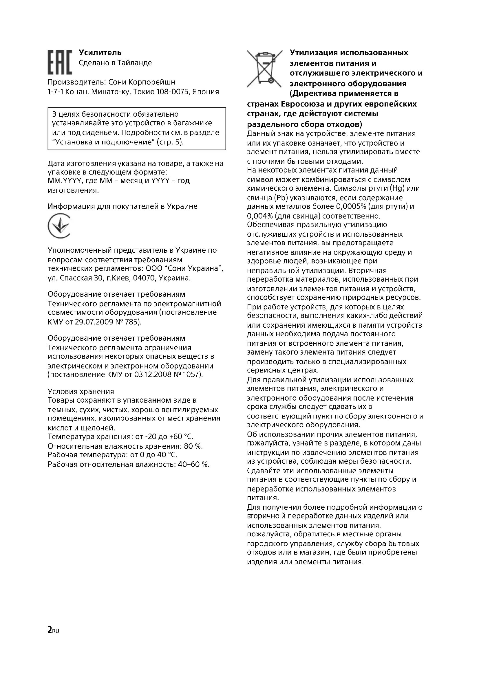 Сделано в Тайланде Производитель: Сони Корпорейшн 1-7-1 Конан, Минато-ку, Токио 108-0075, Япония В целях безопасности обязательно