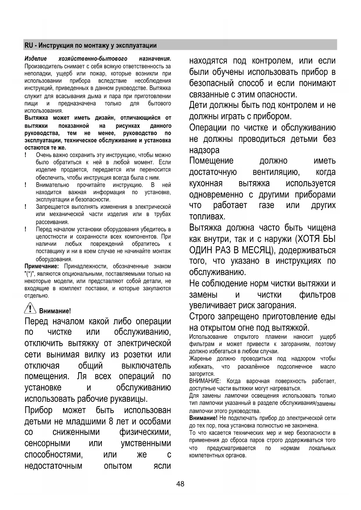 Перед началом какой либо операции по чистке или обслуживанию, отключить вытяжку от электрической сети вынимая вилку из розетки или отключая общий выключатель помещения. Ля всех операций по установке и обслуживанию использовать рабочие рукавицы. Прибор может быть использован детьми не младшими 8 лет и особами со сниженными физическими, сенсорными или умственными способностями, или же с недостаточным опытом ясли находятся под контролем, или если были обучены использовать прибор в безопасный способ и если понимают связанные с этим опасности. Дети должны быть под контролем и не должны играть с прибором. Операции по чистке и обслуживанию не должны проводиться детьми без