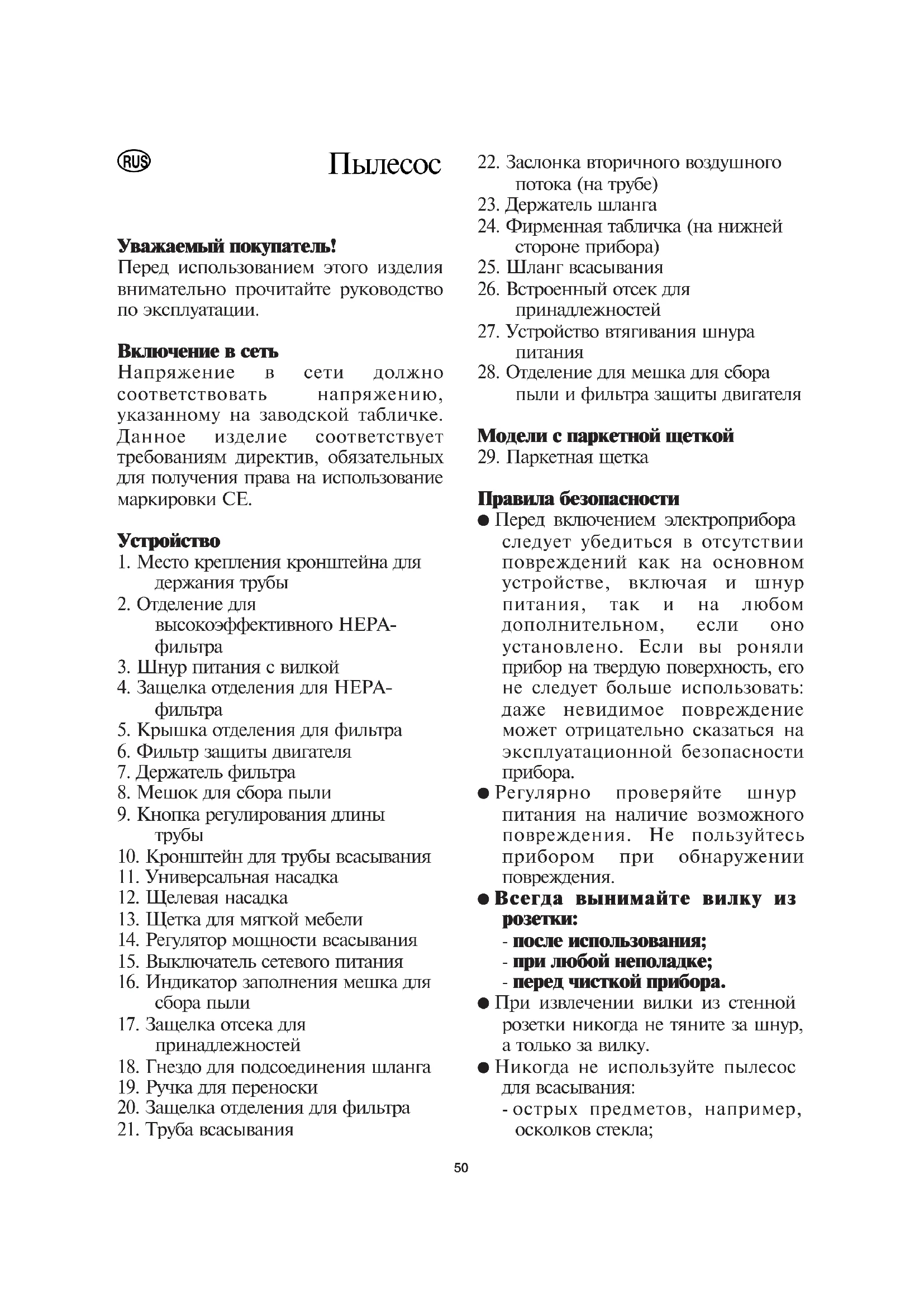 ● . Держите упаковочные материалы в недоступном для детей месте. Ребенок может надеть пакет на голову и задохнуться! ● Всегда проверяйте мешок для сбора пыли на наличие следов повреждения, прежде чем включить прибор в сеть. Не используйте пылесос, если: - мешок для сбора пыли не установлен или повреждён, - индикатор заполнения мешка для сбора пыли показывает, что мешок заполнен полностью, - не установлен фильтр защиты
