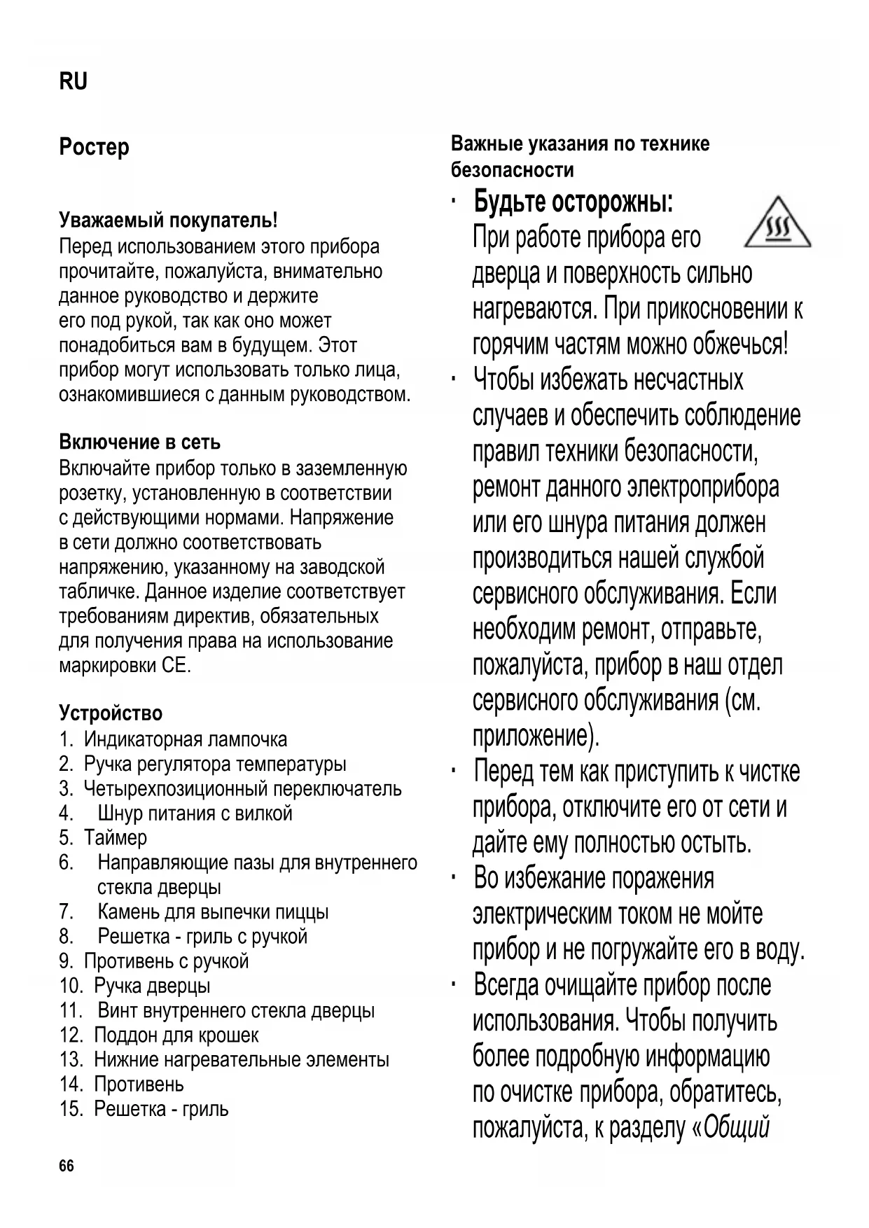 Важные указания по технике безопасности ∙ Будьте осторожны: При работе прибора его дверца и поверхность сильно нагреваются. При прикосновении к горячим частям можно обжечься! ∙ Чтобы избежать несчастных случаев и обеспечить соблюдение правил техники безопасности, ремонт данного электроприбора или его шнура питания должен производиться нашей службой сервисного обслуживания. Если необходим ремонт, отправьте, пожалуйста, прибор в
