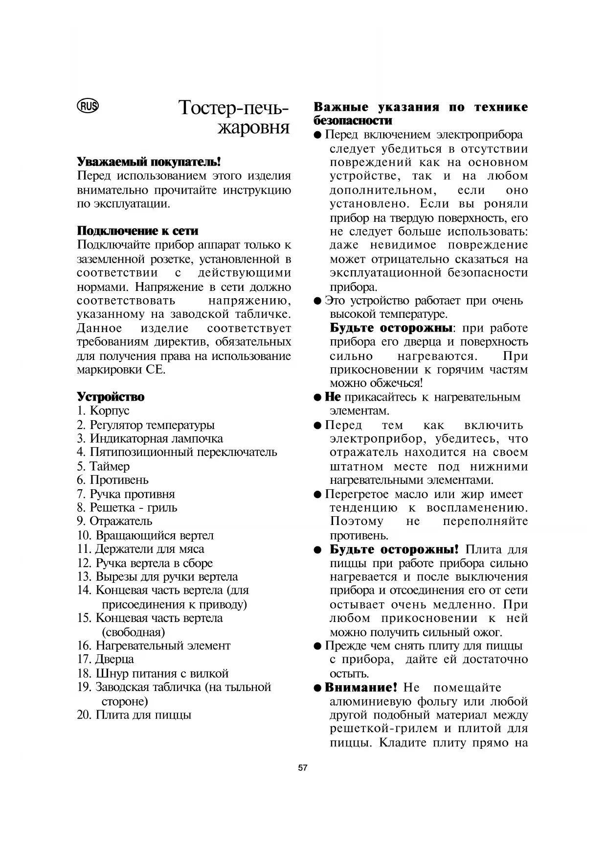 ● Это устройство работает при очень высокой температуре. : при работе прибора его дверца и поверхность сильно нагреваются. При прикосновении к горячим частям можно обжечься! ● прикасайтесь к нагревательным