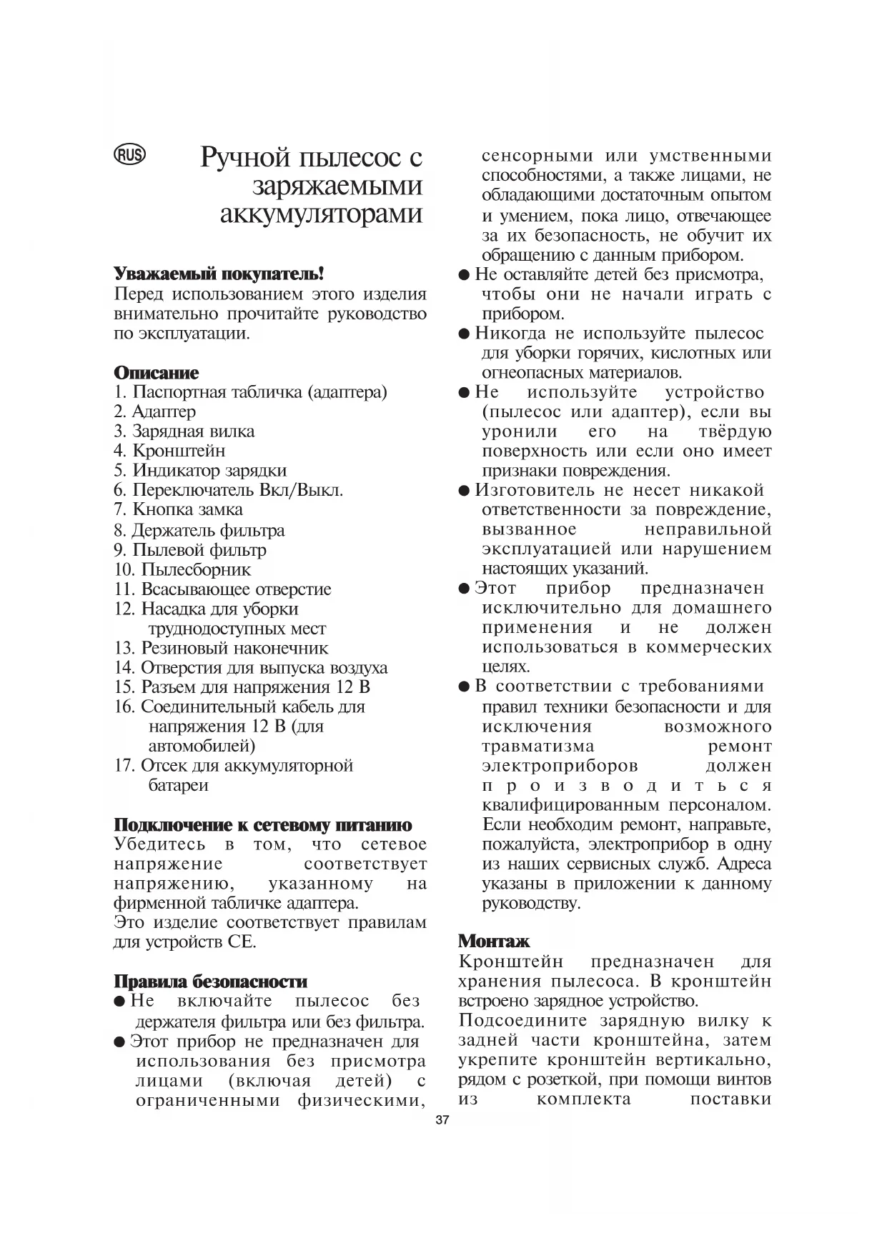 ● Никогда не используйте пылесос для уборки горячих, кислотных или огнеопасных материалов. ● Не используйте устройство (пылесос или адаптер), если вы уронили его на твёрдую поверхность или если оно имеет признаки повреждения. ● Изготовитель не несет никакой ответственности за повреждение, вызванное неправильной эксплуатацией или нарушением настоящих указаний. ● Этот прибор предназначен исключительно для домашнего применения и не должен использоваться в коммерческих