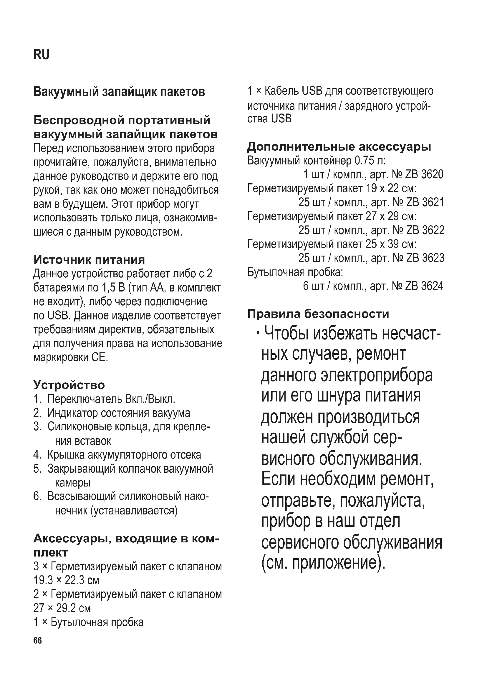 2 × Герметизируемый пакет с клапаном 27 × 29.2 см 1 × Бутылочная пробка 1 × Кабель USB для соответствующего источника питания / зарядного устрой- ства USB Дополнительные аксессуары Вакуумный контейнер 0.75 л: 1 шт / компл., арт. № ZB 3620 Герметизируемый пакет 19 x 22 см: 25 шт / компл., арт. № ZB 3621 Герметизируемый пакет 27 x 29 см: 25 шт / компл., арт. № ZB 3622 Герметизируемый пакет 25 x 39 см: 25 шт / компл., арт. № ZB 3623 Бутылочная пробка: 6 шт / компл., арт. № ZB 3624 Правила безопасности ∙ Чтобы избежать несчаст- ных случаев, ремонт данного электроприбора или его шнура питания должен производиться нашей службой сер- висного обслуживания. Если необходим ремонт, отправьте, пожалуйста, прибор в наш отдел сервисного обслуживания (см. приложение). RU104 x 142 mm