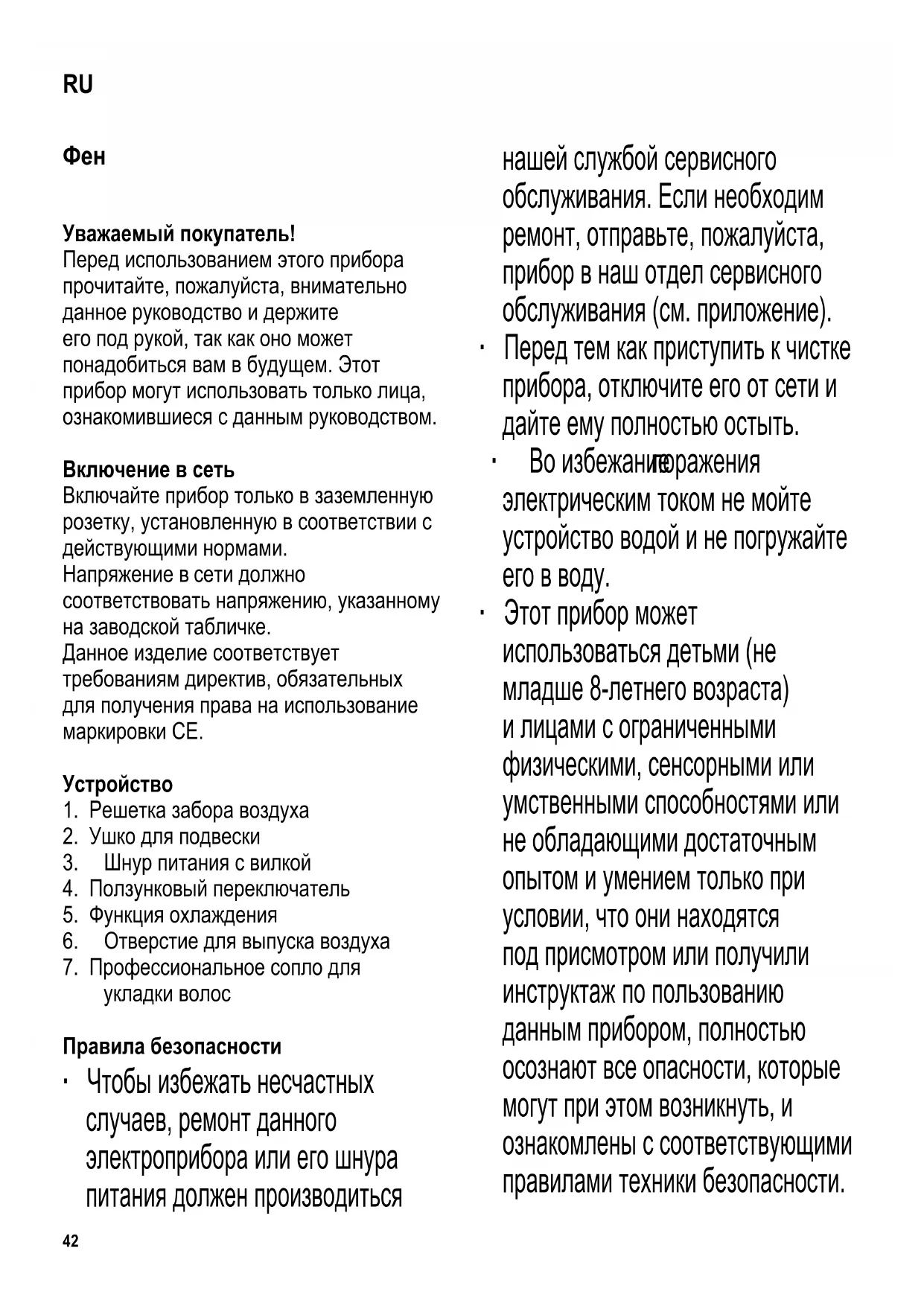 укладки волос Правила безопасности ∙ Чтобы избежать несчастных случаев, ремонт данного электроприбора или его шнура питания должен производиться нашей службой сервисного обслуживания. Если необходим ремонт, отправьте, пожалуйста, прибор в наш отдел сервисного обслуживания (см. приложение). ∙ Перед тем как приступить к чистке прибора, отключите его от сети и дайте ему полностью остыть. ∙ Во избежание