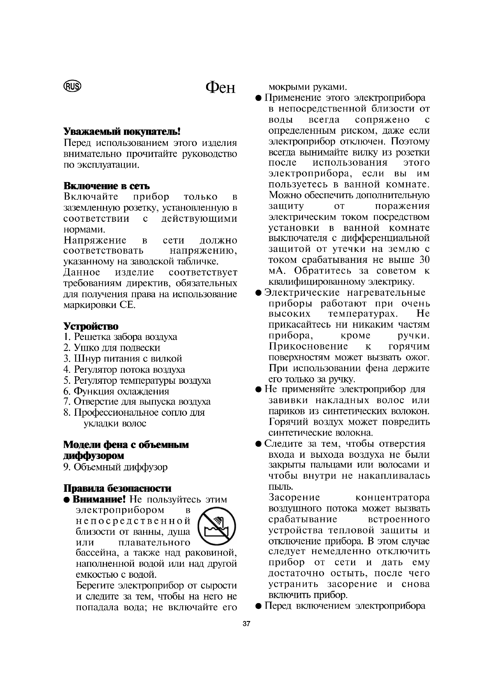 ● ! Не пользуйтесь этим электроприбором в непосредственной близости от ванны, душа или плавательного бассейна, а также над раковиной, наполненной водой или над другой емкостью с водой. Берегите электроприбор от сырости и следите за тем, чтобы на него не попадала вода; не включайте его мокрыми руками. ● Применение этого электроприбора в непосредственной близости от воды всегда сопряжено с определенным риском, даже если электроприбор отключен. Поэтому всегда вынимайте вилку из розетки после использования этого электроприбора, если вы им пользуетесь в ванной комнате. Можно обеспечить дополнительную защиту от поражения электрическим током посредством установки в ванной комнате выключателя с дифференциальной защитой от утечки на землю с током срабатывания не выше 30 мА. Обратитесь за советом к квалифицированному электрику. ● Электрические нагревательные приборы работают при очень высоких температурах. Не прикасайтесь ни никаким частям прибора, кроме ручки. Прикосновение к горячим поверхностям может вызвать ожог. При использовании фена держите его только за ручку. ● Не применяйте электроприбор для завивки накладных волос или париков из синтетических волокон. Горячий воздух может повредить синтетические волокна. ● Следите за тем, чтобы отверстия входа и выхода воздуха не были закрыты пальцами или волосами и чтобы внутри не накапливалась