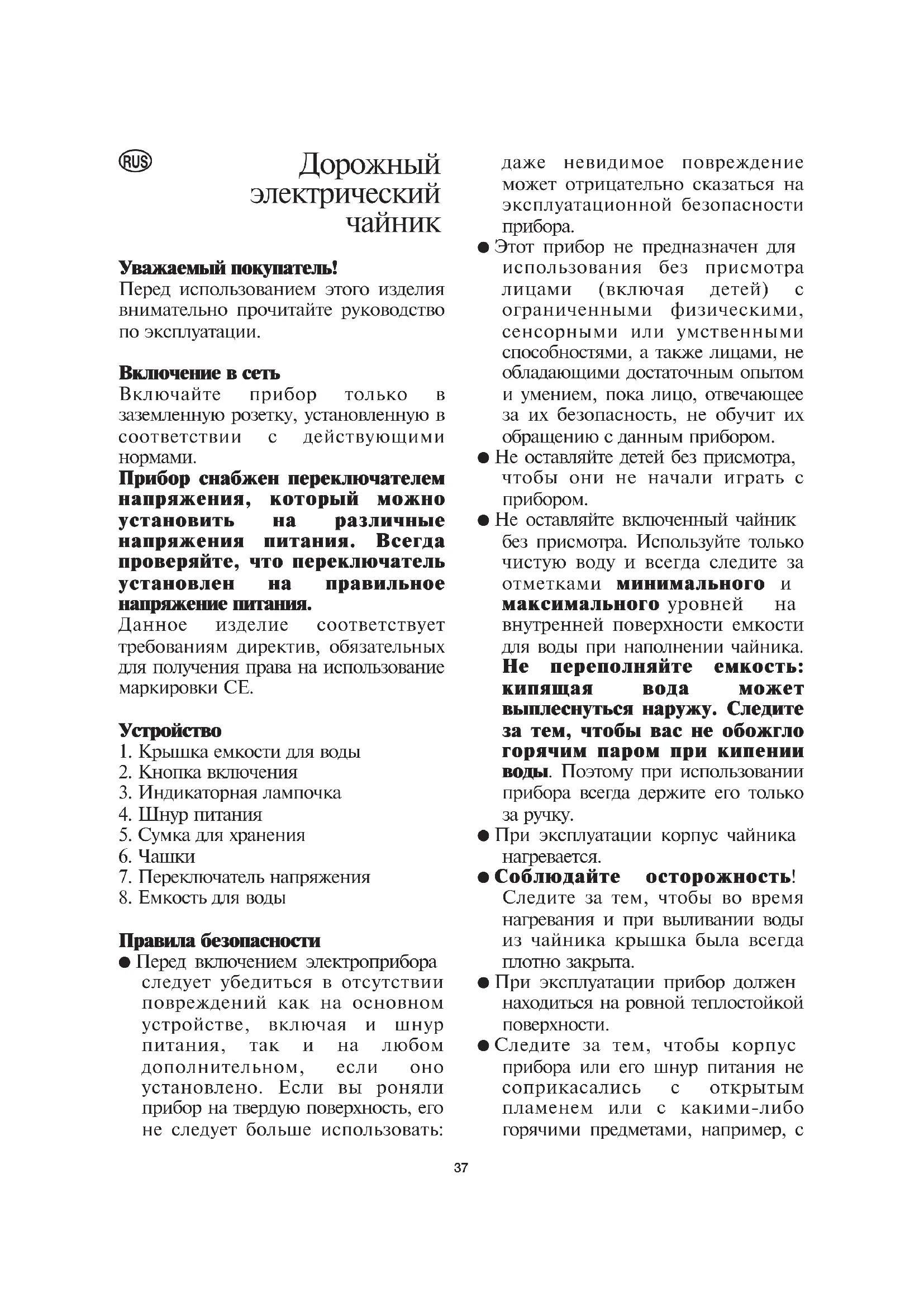 Следите за тем, чтобы во время нагревания и при выливании воды из чайника крышка была всегда плотно закрыта. ● При эксплуатации прибор должен находиться на ровной теплостойкой поверхности. ● Следите за тем, чтобы корпус прибора или его шнур питания не соприкасались с открытым пламенем или с какими-либо горячими предметами, например, с
