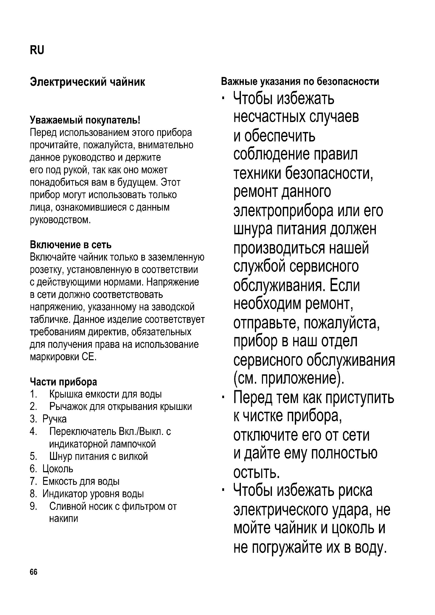∙ Чтобы избежать риска электрического удара, не мойте чайник и цоколь и не погружайте их в воду. RU67 Не мойте их под краном. ∙ Прибор необходимо регулярно очищать от накипи. Емкость для воды следует протирать влажной тканью по мере необходимости. ∙ Подробная информация о чистке прибора находится в разделе «Общий уход и