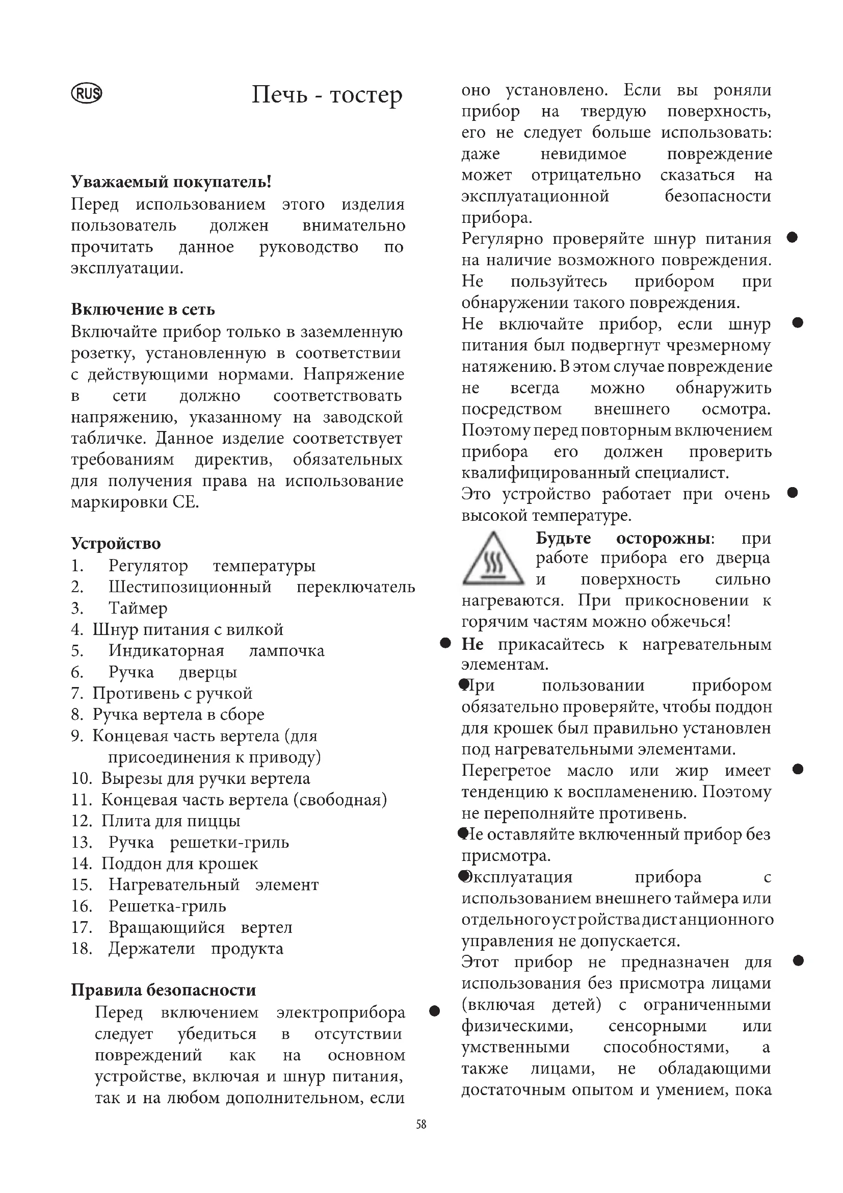 сбоку: на 12 см; сзади: на 12 см; сверху: на 12 см. Не устанавливайте устройство и не z используйте его около настенных шкафов или под ними, или под такими предметами, как занавеси и другие воспламеняемые материалы Во время работы устройство должно z стоять на жаропрочной поверхности, устойчивой к брызгам и пятнам. Не устанавливайте устройство на горячие поверхности или около них или у открытого пламени или воспламеняющихся паров. Будьте осторожны! z Плита для пиццы при работе прибора сильно нагревается и после выключения прибора и отсоединения его от сети остывает очень медленно. При любом прикосновении к ней можно получить сильный ожог. Прежде чем снять плиту для пиццы с z прибора, дайте ей достаточно остыть. Внимание! z Не помещайте алюминиевую фольгу или любой другой подобный материал между решеткой-грилем и плитой для пиццы. Кладите плиту прямо на решетку. Следите за тем, чтобы шнур питания z не соприкасался с нагревающейся поверхностью прибора. Не допускайте свободного провисания z шнура питания. Обязательно выключайте прибор и z вынимайте вилку из розетки: после использования; - при любой неполадке; - перед чисткой прибора. - При извлечении вилки из стенной z розетки никогда не тяните за провод, а только за вилку. Изготовитель не несет никакой z ответственности за повреждение, вызванное неправильной эксплуатацией или нарушением настоящих указаний. Этот прибор предназначен z исключительно для домашнего применения и не должен использоваться в коммерческих целях. В соответствии с требованиями z правил техники безопасности и для исключения возможного травматизма ремонт электроприборов, включая и замену шнура питания, должен производиться квалифицированным персоналом. Если необходим ремонт, направьте, пожалуйста, электроприбор в одну из наших сервисных служб. Адреса указаны в приложении к данному руководству. Регулировка температуры Нужная температура задается при помощи регулятора температуры. Положения шестипозиционного переключателя верхний нагрев верхний и нижний нагрев верхний нагрев с функцией конвекции горячего воздуха верхний и нижний нагрев с функцией конвекции горячего воздуха верхний нагрев с вращающимся