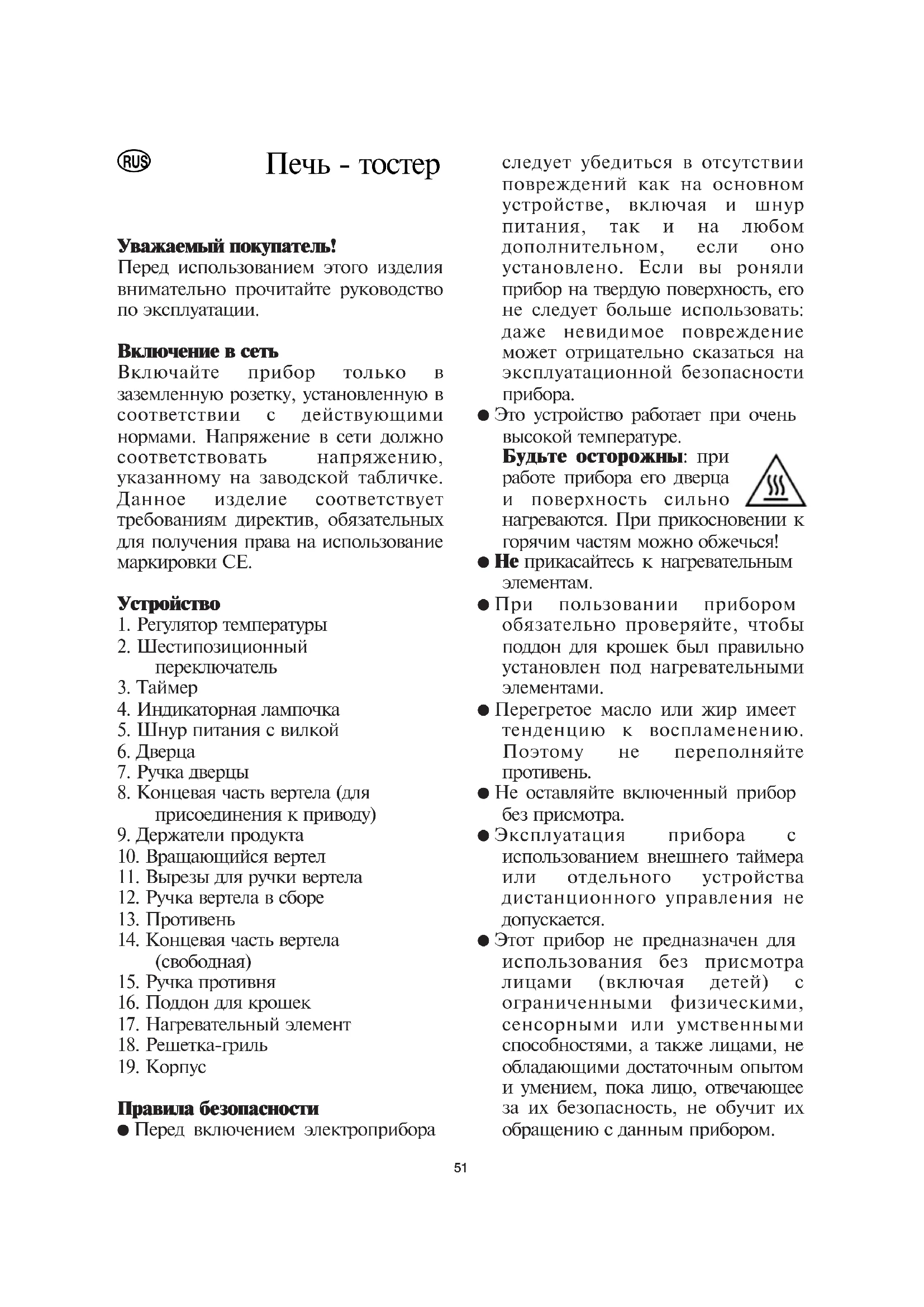 ● При извлечении вилки из стенной розетки никогда не тяните за провод, а только за вилку. ● Изготовитель не несет никакой ответственности за повреждение, вызванное неправильной эксплуатацией или нарушением настоящих указаний. ● Этот прибор предназначен исключительно для домашнего применения и не должен использоваться в коммерческих