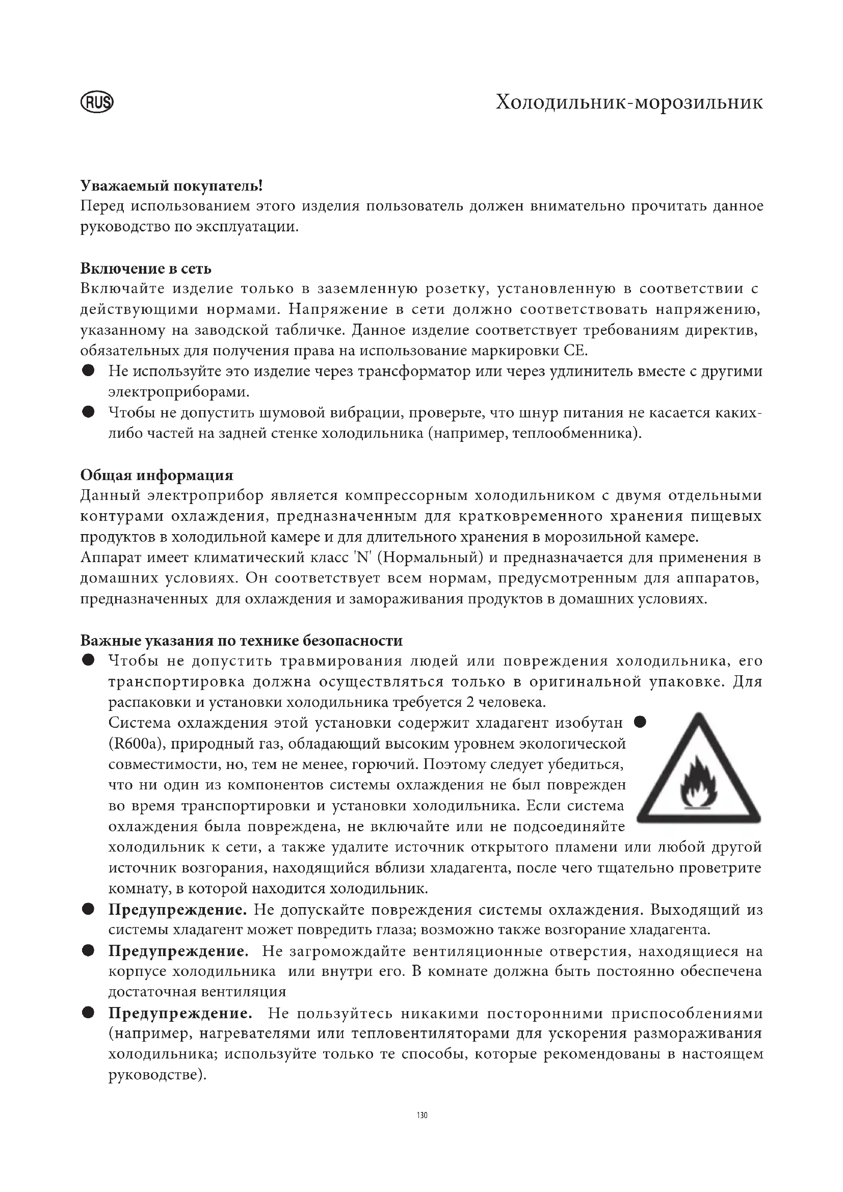 Χωρητικότητα ψύξης, κιλά/24ώρες 3 Θερμοκρασία ψύξης, °C -18 Διαστάσεις (σε χιλιοστά) 1445 x 550 x 570 Βάρος, κιλά 51 Ηλεκτρικές προδιαγραφές Βλέπε πινακίδα ονομαστικών τιμών Μονωτικός αφρός Κυκλοπεντάνιο Εκπομπή θορύβου 40 dB(A) 129Холодильник-морозильник Уважаемый покупатель! Перед использованием этого изделия пользователь должен внимательно прочитать данное руководство по эксплуатации. Включение в сеть Включайте изделие только в заземленную розетку, установленную в соответствии с действующими нормами. Напряжение в сети должно соответствовать напряжению, указанному на заводской табличке. Данное изделие соответствует требованиям директив, обязательных для получения права на использование маркировки СЕ. Не используйте это изделие через трансформатор или через удлинитель вместе с другими ● электроприборами. Чтобы не допустить шумовой вибрации, проверьте, что шнур питания не касается каких- ● либо частей на задней стенке холодильника (например, теплообменника). Общая информация Данный электроприбор является компрессорным холодильником с двумя отдельными контурами охлаждения, предназначенным для кратковременного хранения пищевых продуктов в холодильной камере и для длительного хранения в морозильной камере. Аппарат имеет климатический класс 'N' (Нормальный) и предназначается для применения в домашних условиях. Он соответствует всем нормам, предусмотренным для аппаратов, предназначенных для охлаждения и замораживания продуктов в домашних условиях. Важные указания по технике безопасности Чтобы не допустить травмирования людей или повреждения холодильника, его ● транспортировка должна осуществляться только в оригинальной упаковке. Для распаковки и установки холодильника требуется 2 человека. Система охлаждения этой установки содержит хладагент изобутан ● (R600a), природный газ, обладающий высоким уровнем экологической совместимости, но, тем не менее, горючий. Поэтому следует убедиться, что ни один из компонентов системы охлаждения не был поврежден во время транспортировки и установки холодильника. Если система охлаждения была повреждена, не включайте или не подсоединяйте холодильник к сети, а также удалите источник открытого пламени или любой другой источник возгорания, находящийся вблизи хладагента, после чего тщательно проветрите комнату, в которой находится холодильник. Предупреждение. ● Не допускайте повреждения системы охлаждения. Выходящий из системы хладагент может повредить глаза; возможно также возгорание хладагента. Предупреждение. ● Не загромождайте вентиляционные отверстия, находящиеся на корпусе холодильника или внутри его. В комнате должна быть постоянно обеспечена достаточная вентиляция Предупреждение. ● Не пользуйтесь никакими посторонними приспособлениями (например, нагревателями или тепловентиляторами для ускорения размораживания холодильника; используйте только те способы, которые рекомендованы в настоящем руководстве).