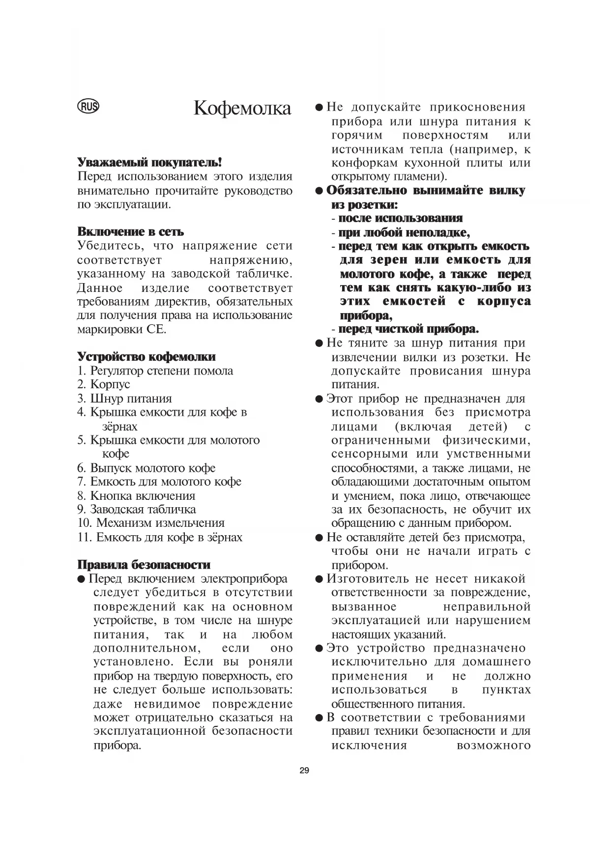 RUS 29травматизма ремонт электроприборов, включая и замену шнура питания, должен производиться квалифицированным персоналом. Если необходим ремонт, направьте, пожалуйста, электроприбор в одну из наших сервисных служб. Адреса указаны в приложении к данному руководству.