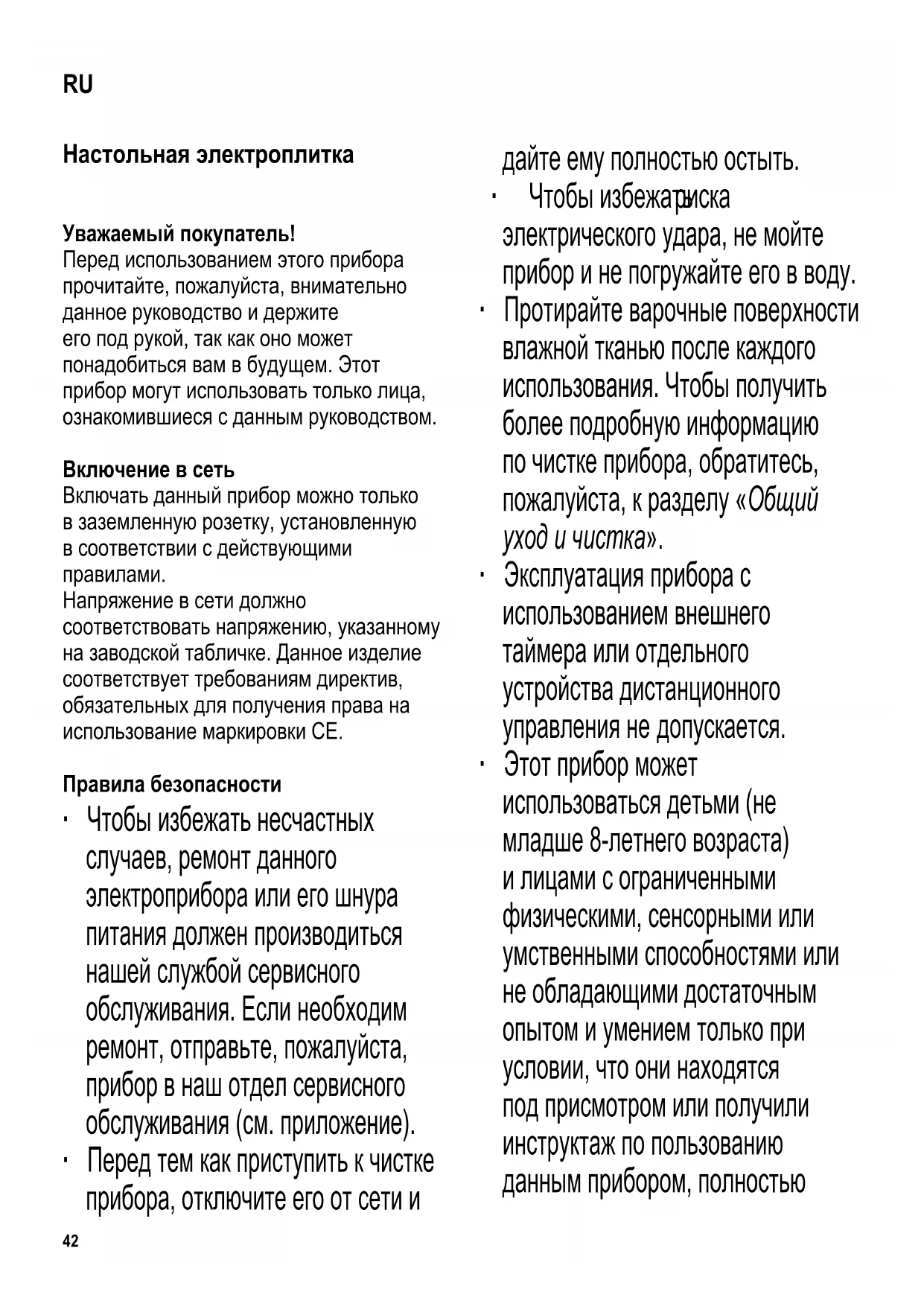 электрического удара, не мойте прибор и не погружайте его в воду. ∙ Протирайте варочные поверхности влажной тканью после каждого использования. Чтобы получить более подробную информацию по чистке прибора, обратитесь, пожалуйста, к разделу «Общий уход и чистка». ∙ Эксплуатация прибора с использованием внешнего таймера или отдельного устройства дистанционного управления не допускается. ∙ Этот прибор может использоваться детьми (не младше 8-летнего возраста) и лицами с ограниченными физическими, сенсорными или умственными способностями или не обладающими достаточным опытом и умением только при условии, что они находятся под присмотром или получили инструктаж по пользованию данным прибором, полностью RU43 осознают все опасности, которые могут при этом возникнуть, и ознакомлены с соответствующими правилами техники безопасности. ∙ Не разрешайте детям играть с