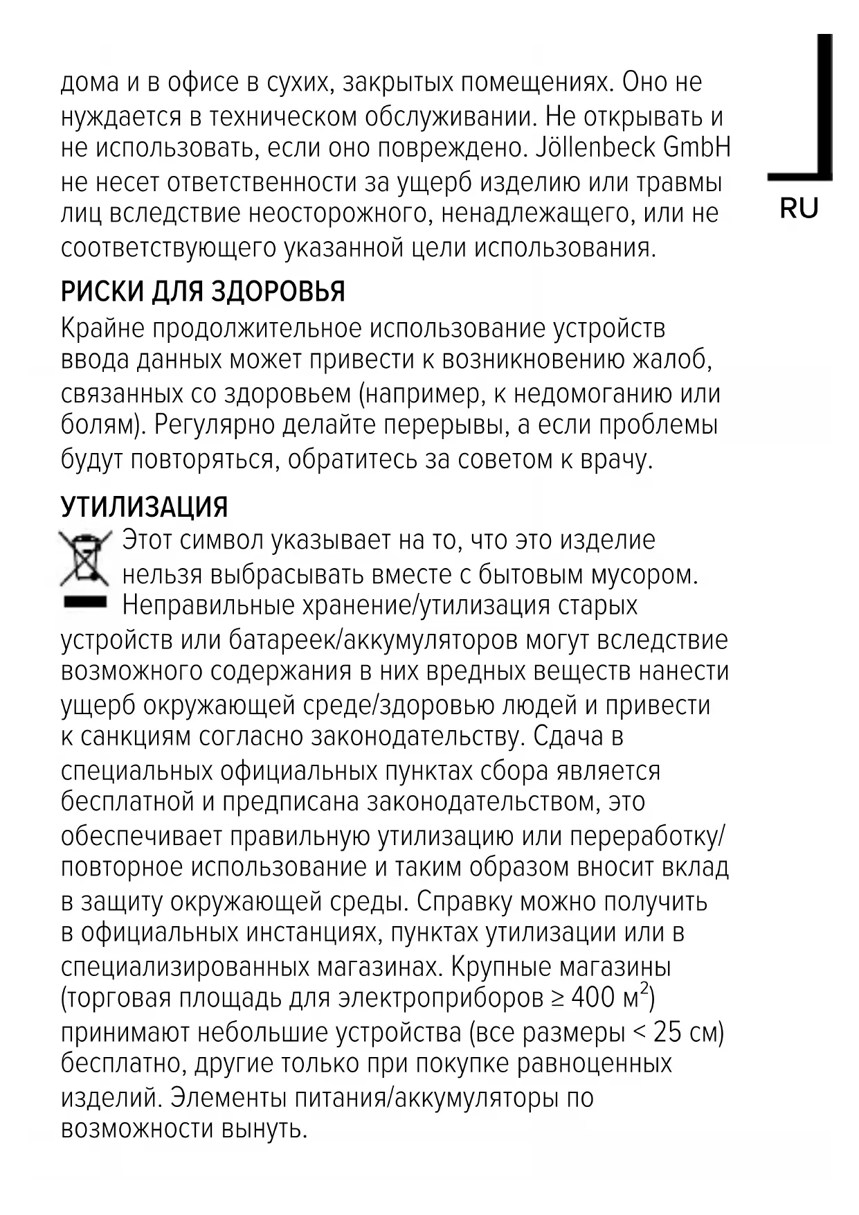 ИСПОЛЬЗОВАНИЕ ПО НАЗНАЧЕНИЮ Это изделие предназначено только для использования в качестве устройства для ввода для подключения к компьютеруRU дома и в офисе в сухих, закрытых помещениях. Оно не нуждается в техническом обслуживании. Не открывать и не использовать, если оно повреждено. Jöllenbeck GmbH не несет ответственности за ущерб изделию или травмы лиц вследствие неосторожного, ненадлежащего, или не соответствующего указанной цели использования. РИСКИ ДЛЯ ЗДОРОВЬЯ Крайне продолжительное использование устройств ввода данных может привести к возникновению жалоб, связанных со здоровьем (например, к недомоганию или болям). Регулярно делайте перерывы, а если проблемы будут повторяться, обратитесь за советом к врачу.