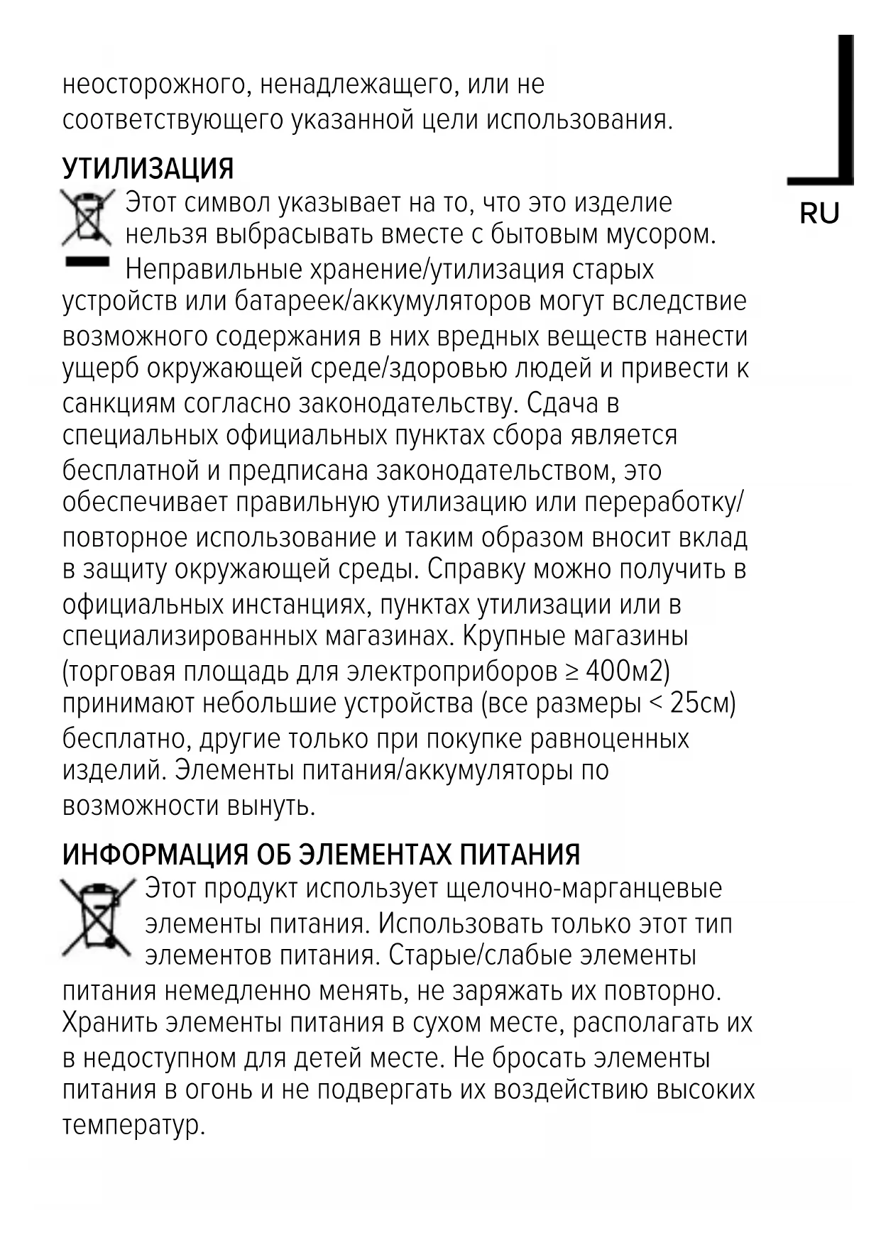 Этот символ указывает на то, что это изделие нельзя выбрасывать вместе с бытовым мусором. Неправильные хранение/утилизация старых устройств или батареек/аккумуляторов могут вследствие возможного содержания в них вредных веществ нанести ущерб окружающей среде/здоровью людей и привести к санкциям согласно законодательству. Сдача в специальных официальных пунктах сбора является бесплатной и предписана законодательством, это обеспечивает правильную утилизацию или переработку/ повторное использование и таким образом вносит вклад в защиту окружающей среды. Справку можно получить в официальных инстанциях, пунктах утилизации или в специализированных магазинах. Крупные магазины (торговая площадь для электроприборов ≥ 400м2) принимают небольшие устройства (все размеры < 25см) бесплатно, другие только при покупке равноценных изделий. Элементы питания/аккумуляторы по возможности вынуть. ИНФОРМАЦИЯ ОБ ЭЛЕМЕНТАХ ПИТАНИЯ Этот продукт использует щелочно-марганцевые элементы питания. Использовать только этот тип элементов питания. Старые/слабые элементы питания немедленно менять, не заряжать их повторно. Хранить элементы питания в сухом месте, располагать их в недоступном для детей месте. Не бросать элементы питания в огонь и не подвергать их воздействию высоких температур.ИНФОРМАЦИЯ О СООТВЕТСТВИИ Из-за влияния сильных статических, электрических или высокочастотных полей (излучение радиоустановок, мобильных телефонов, микроволновых печей) могут возникнуть радиопомехи. В этом случае нужно увеличить расстояние от источников помех. ЗАЯВЛЕНИЕ О СООТВЕТСТВИИ Данным Jöllenbeck GmbH заявляет, что это изделие отвечает Директиве ЕС 2014/53/EC. Полный текст заявления о соответствии можно запросить через адрес в Интернете www.speedlink.com. РИСКИ ДЛЯ ЗДОРОВЬЯ Крайне продолжительное использование устройств ввода данных может привести к возникновению жалоб, связанных со здоровьем (например, к недомоганию или болям). Регулярно делайте перерывы, а если проблемы будут повторяться, обратитесь за советом к врачу. ТЕХНИЧЕСКАЯ ПОДДЕРЖКА www.speedlink.com/support Сохраните эту информацию для использования в будущем.