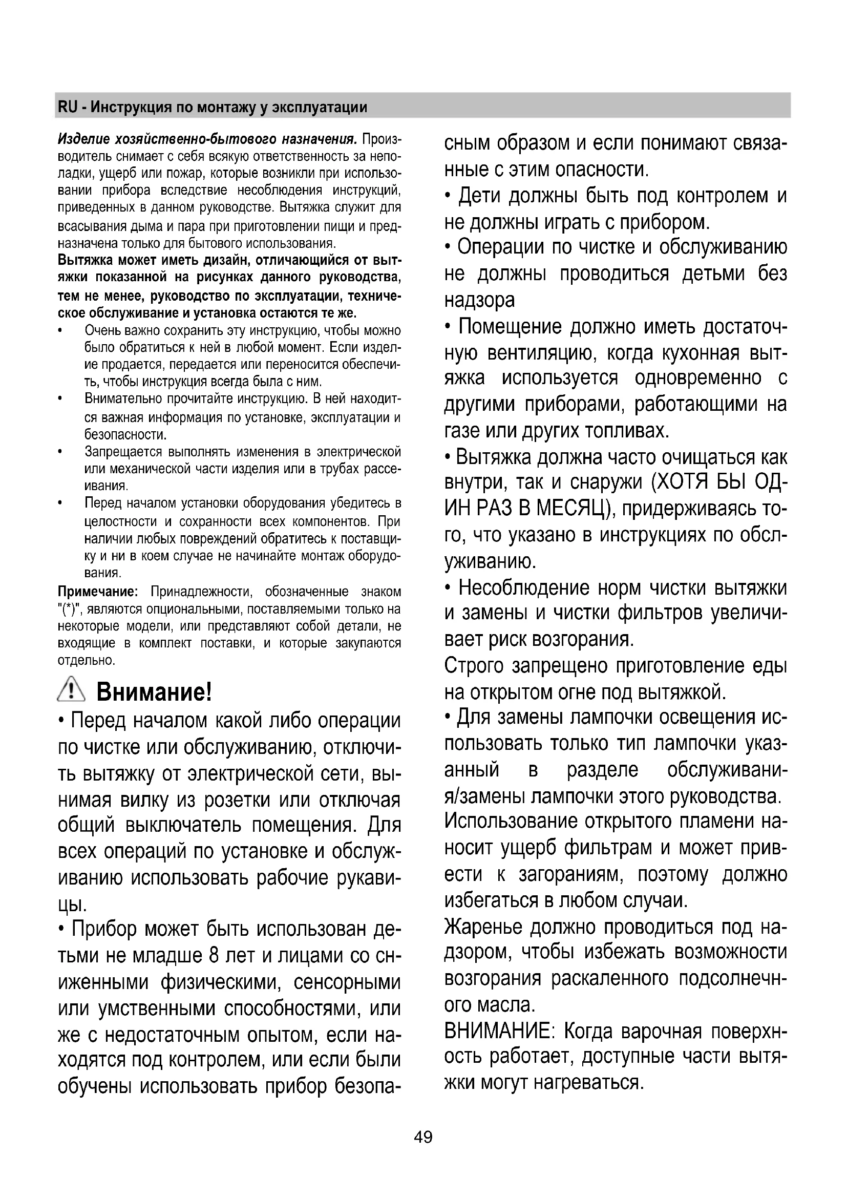 Szerelje vissza a rostélyt. Amennyiben a világítás nem működik, mielőtt a műszaki szer- vizszolgálatot hívná ,ellenőrizze, hogy az égők helyesen ille- szkednek-e a foglalatba.49 RU - Инструкция по монтажу у эксплуатации Изделие хозяйственно-бытового назначения. Произ- водитель снимает с себя всякую ответственность за непо- ладки, ущерб или пожар, которые возникли при использо- вании прибора вследствие несоблюдения инструкций, приведенных в данном руководстве. Вытяжка служит для всасывания дыма и пара при приготовлении пищи и пред- назначена только для бытового использования. Вытяжка может иметь дизайн, отличающийся от выт- яжки показанной на рисунках данного руководства, тем не менее, руководство по эксплуатации, техниче- ское обслуживание и установка остаются те же.
