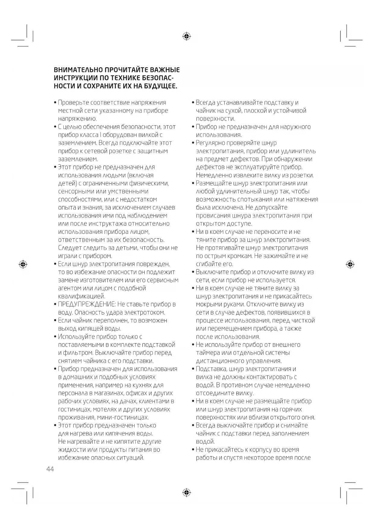 - Этот прибор предназначен только для нагрева или кипячения воды. Не нагревайте и не кипятите другие жидкости или продукты питания во избежание опасных ситуаций.