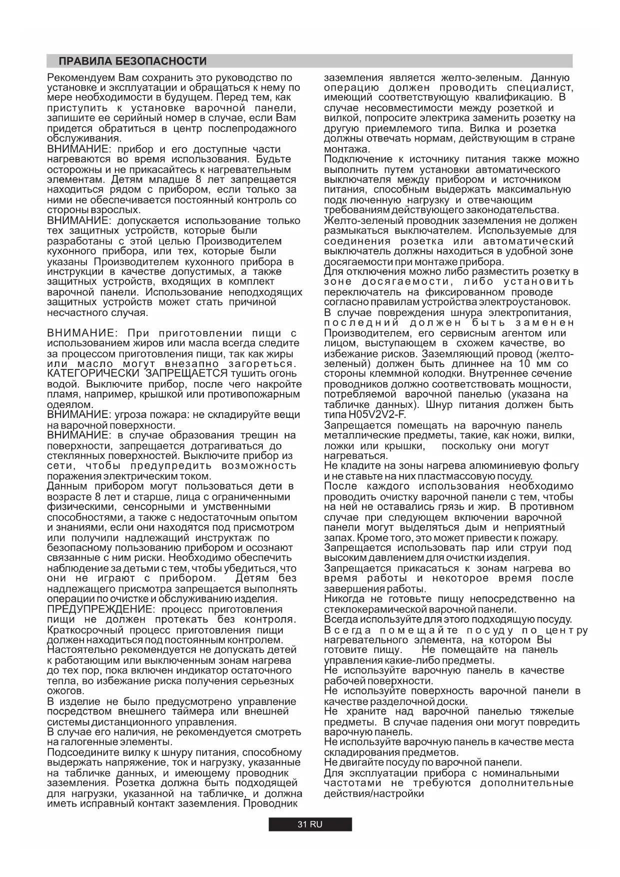 ВНИМАНИЕ: допускается использование только тех защитных устройств, которые были разработаны с этой целью Производителем кухонного прибора, или тех, которые были указаны Производителем кухонного прибора в инструкции в качестве допустимых, а также защитных устройств, входящих в комплект варочной панели. Использование неподходящих защитных устройств может стать причиной несчастного случая. Подсоедините вилку к шнуру питания, способному выдержать напряжение, ток и нагрузку, указанные на табличке данных, и имеющему проводник заземления. Розетка должна быть подходящей для нагрузки, указанной на табличке, и должна иметь исправный контакт заземления. Проводник ВНИМАНИЕ: прибор и его доступные части нагреваются во время использования. Будьте осторожны и не прикасайтесь к нагревательным элементам. Детям младше 8 лет запрещается находиться рядом с прибором, если только за ними не обеспечивается постоянный контроль со стороны взрослых. Данным прибором могут пользоваться дети в возрасте 8 лет и старше, лица с ограниченными физическими, сенсорными и умственными способностями, а также с недостаточным опытом и знаниями, если они находятся под присмотром или получили надлежащий инструктаж по безопасному пользованию прибором и осознают связанные с ним риски. Необходимо обеспечить наблюдение за детьми с тем, чтобы убедиться, что они не играют с прибором. Детям без надлежащего присмотра запрещается выполнять операции по очистке и обслуживанию изделия. ВНИМАНИЕ: угроза пожара: не складируйте вещи на варочной поверхности. Рекомендуем Вам сохранить это руководство по установке и эксплуатации и обращаться к нему по мере необходимости в будущем. Перед тем, как приступить к установке варочной панели, запишите ее серийный номер в случае, если Вам придется обратиться в центр послепродажного обслуживания. В изделие не было предусмотрено управление посредством внешнего таймера или внешней системы дистанционного управления. ВНИМАНИЕ: в случае образования трещин на поверхности, запрещается дотрагиваться до стеклянных поверхностей. Выключите прибор из сети, чтобы предупредить возможность поражения электрическим током. ПРЕДУПРЕЖДЕНИЕ: процесс приготовления пищи не должен протекать без контроля. Краткосрочный процесс приготовления пищи должен находиться под постоянным контролем. ВНИМАНИЕ: При приготовлении пищи с использованием жиров или масла всегда следите за процессом приготовления пищи, так как жиры или масло могут внезапно загореться. КАТЕГОРИЧЕСКИ ЗАПРЕЩАЕТСЯ тушить огонь водой. Выключите прибор, после чего накройте пламя, например, крышкой или противопожарным