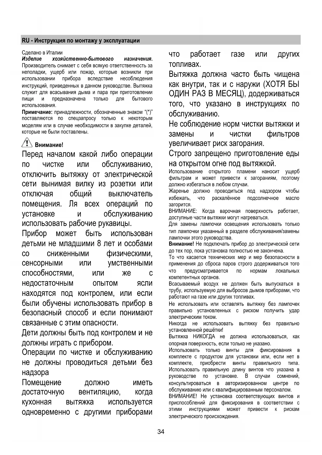Перед началом какой либо операции по чистке или обслуживанию, отключить вытяжку от электрической сети вынимая вилку из розетки или отключая общий выключатель помещения. Ля всех операций по установке и обслуживанию использовать рабочие рукавицы. Прибор может быть использован детьми не младшими 8 лет и особами со сниженными физическими, сенсорными или умственными способностями, или же с недостаточным опытом ясли находятся под контролем, или если были обучены использовать прибор в безопасный способ и если понимают связанные с этим опасности. Дети должны быть под контролем и не должны играть с прибором. Операции по чистке и обслуживанию не должны проводиться детьми без