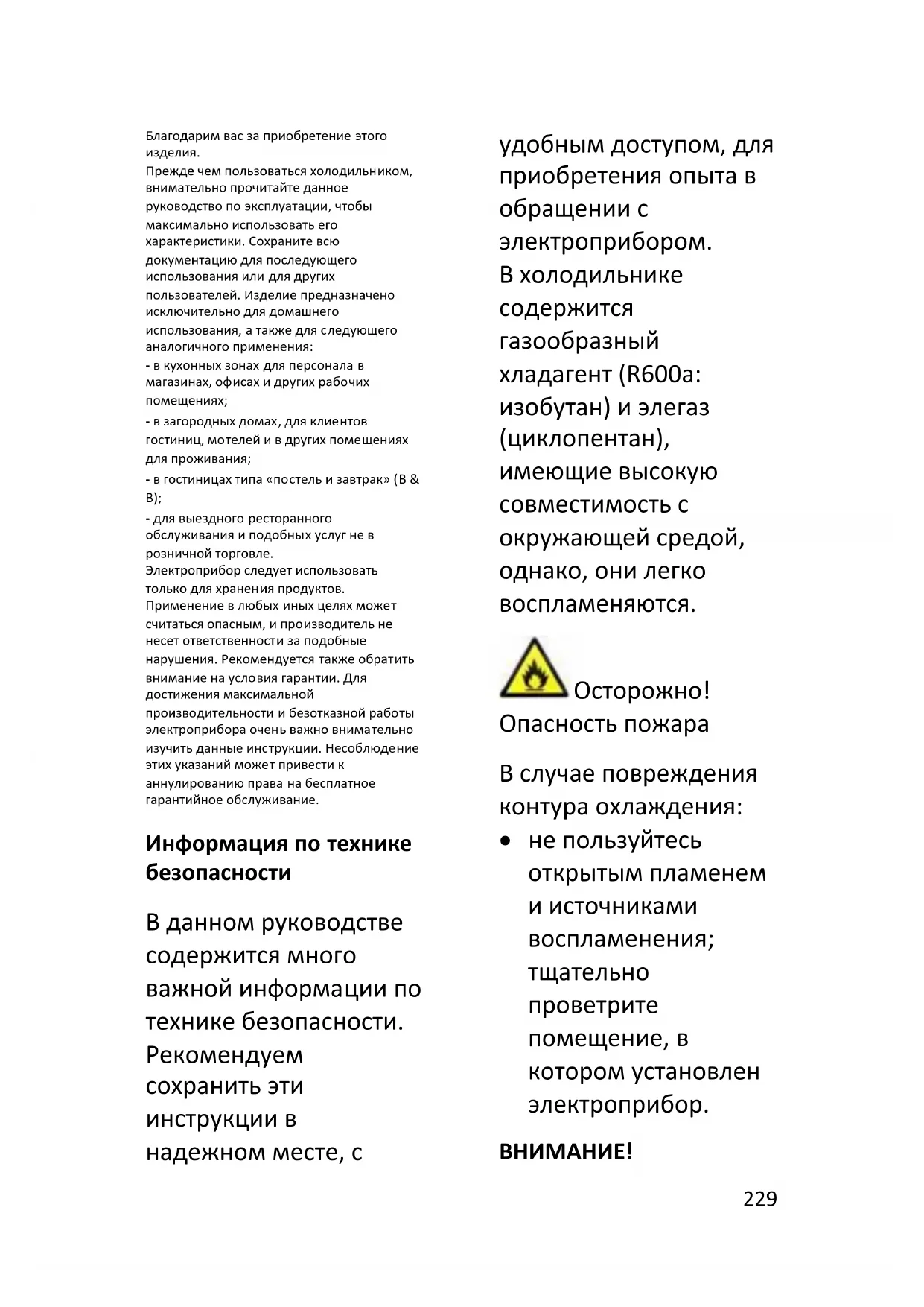 Прежде чем пользоваться холодильником, внимательно прочитайте данное руководство по эксплуатации, чтобы максимально использовать его характеристики. Сохраните всю документацию для последующего использования или для других пользователей. Изделие предназначено исключительно для домашнего использования, а также для следующего аналогичного применения: - в кухонных зонах для персонала в магазинах, офисах и других рабочих помещениях; - в загородных домах, для клиентов гостиниц, мотелей и в других помещениях для проживания; - в гостиницах типа «постель и завтрак» (B & B); - для выездного ресторанного обслуживания и подобных услуг не в розничной торговле. Электроприбор следует использовать только для хранения продуктов. Применение в любых иных целях может считаться опасным, и производитель не несет ответственности за подобные нарушения. Рекомендуется также обратить внимание на условия гарантии. Для достижения максимальной производительности и безотказной работы электроприбора очень важно внимательно изучить данные инструкции. Несоблюдение этих указаний может привести к аннулированию права на бесплатное гарантийное обслуживание. Информация по технике безопасности В данном руководстве содержится много важной информации по технике безопасности. Рекомендуем сохранить эти инструкции в надежном месте, с удобным доступом, для приобретения опыта в обращении с электроприбором. В холодильнике