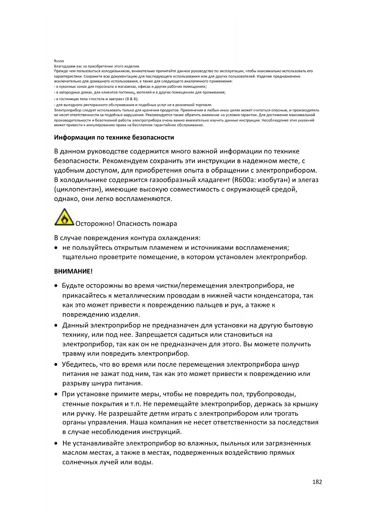 - УТИЛИЗАЦИЯ 82 Russo Благодарим вас за приобретение этого изделия. Прежде чем пользоваться холодильником, внимательно прочитайте данное руководство по эксплуатации, чтобы максимально использовать его характеристики. Сохраните всю документацию для последующего использования или для других пользователей. Изделие предназначено исключительно для домашнего использования, а также для следующего аналогичного применения: - в кухонных зонах для персонала в магазинах, офисах и других рабочих помещениях; - в загородных домах, для клиентов гостиниц, мотелей и в других помещениях для проживания; - в гостиницах типа «постель и завтрак» (B & B); - для выездного ресторанного обслуживания и подобных услуг не в розничной торговле. Электроприбор следует использовать только для хранения продуктов. Применение в любых иных целях может считаться опасным, и производитель не несет ответственности за подобные нарушения. Рекомендуется также обратить внимание на условия гарантии. Для достижения максимальной производительности и безотказной работы электроприбора очень важно внимательно изучить данные инструкции. Несоблюдение этих указаний может привести к аннулированию права на бесплатное гарантийное обслуживание. Информация по технике безопасности В данном руководстве содержится много важной информации по технике безопасности. Рекомендуем сохранить эти инструкции в надежном месте, с удобным доступом, для приобретения опыта в обращении с электроприбором. В холодильнике содержится газообразный хладагент (R600a: изобутан) и элегаз (циклопентан), имеющие высокую совместимость с окружающей средой, однако, они легко воспламеняются. Осторожно! Опасность пожара В случае повреждения контура охлаждения: p. 1931