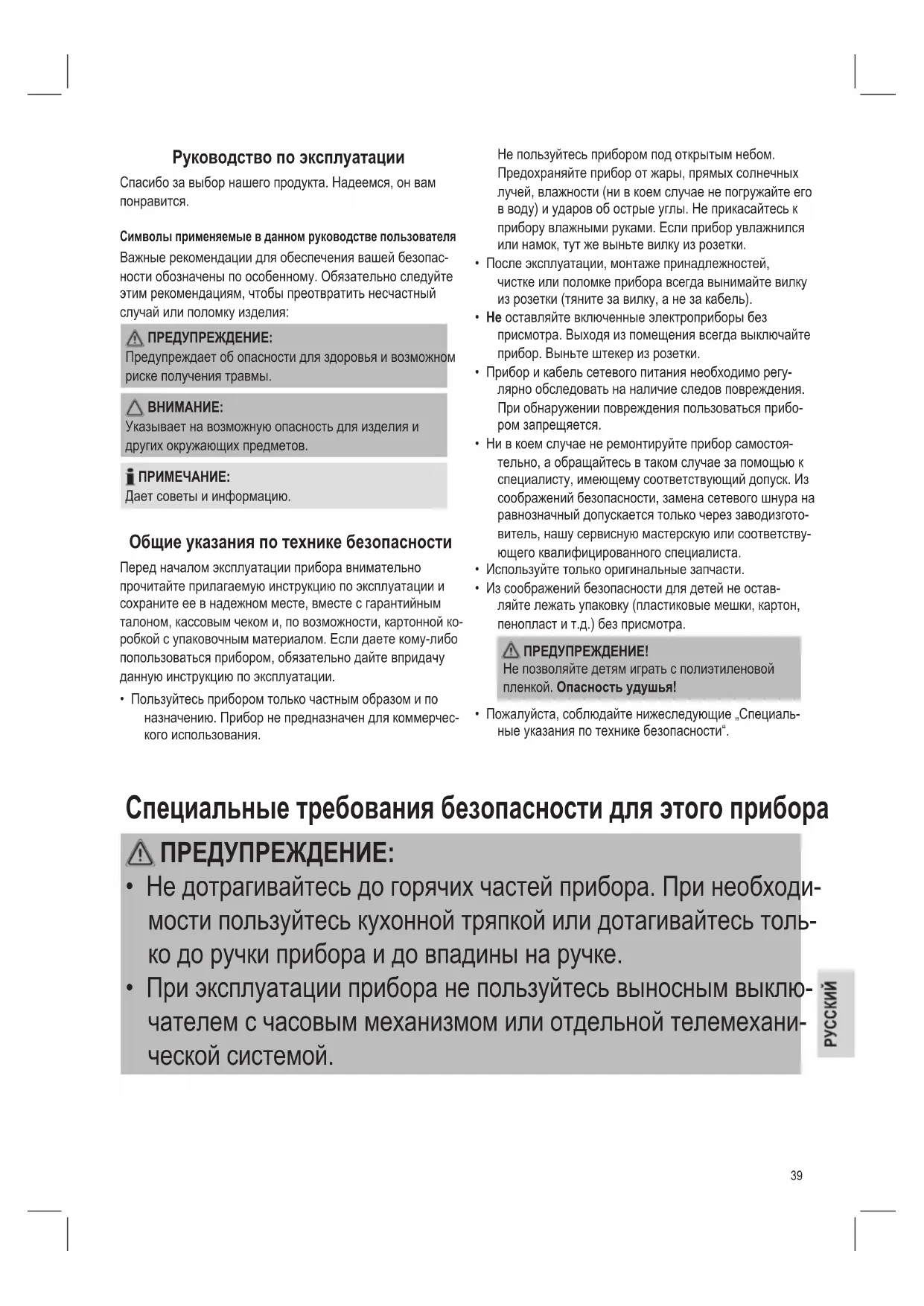 Указывает на возможную опасность для изделия и других окружающих предметов. ПРИМЕЧАНИЕ: Дает советы и информацию. Общие указания по технике безопасности Перед началом эксплуатации прибора внимательно прочитайте прилагаемую инструкцию по эксплуатации и сохраните ее в надежном месте, вместе с гарантийным талоном, кассовым чеком и, по возможности, картонной ко- робкой с упаковочным материалом. Если даете кому-либо попользоваться прибором, обязательно дайте впридачу данную инструкцию по эксплуатации.