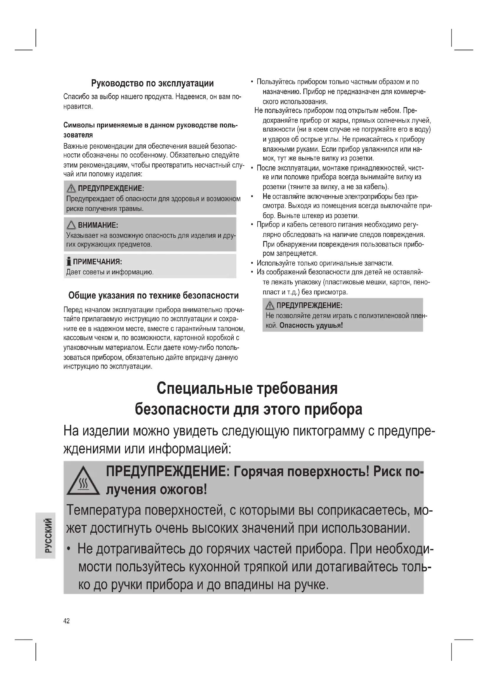 - Не дотрагивайтесь до горячих частей прибора. При необходи- мости пользуйтесь кухонной тряпкой или дотагивайтесь толь- ко до ручки прибора и до впадины на ручке.43 ПРЕДУПРЕЖДЕНИЕ: