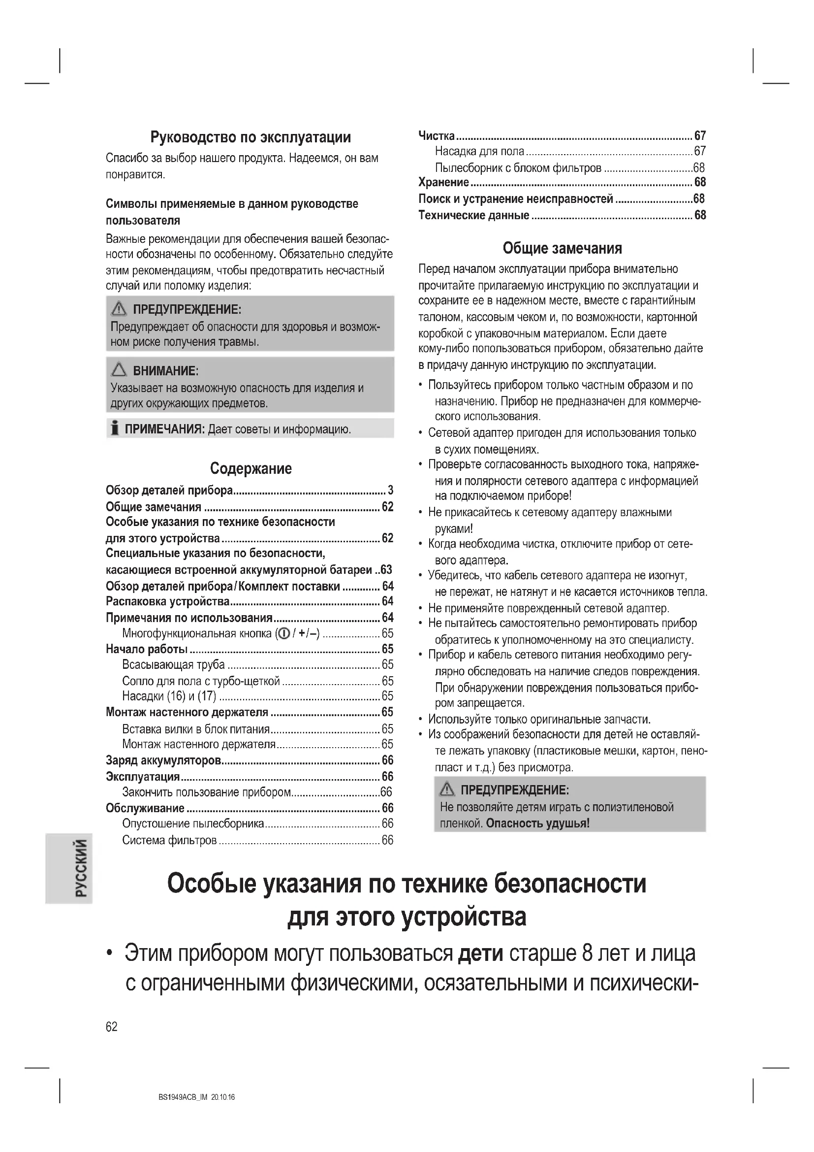 - Особые указания по технике безопасности для этого устройства p. 62