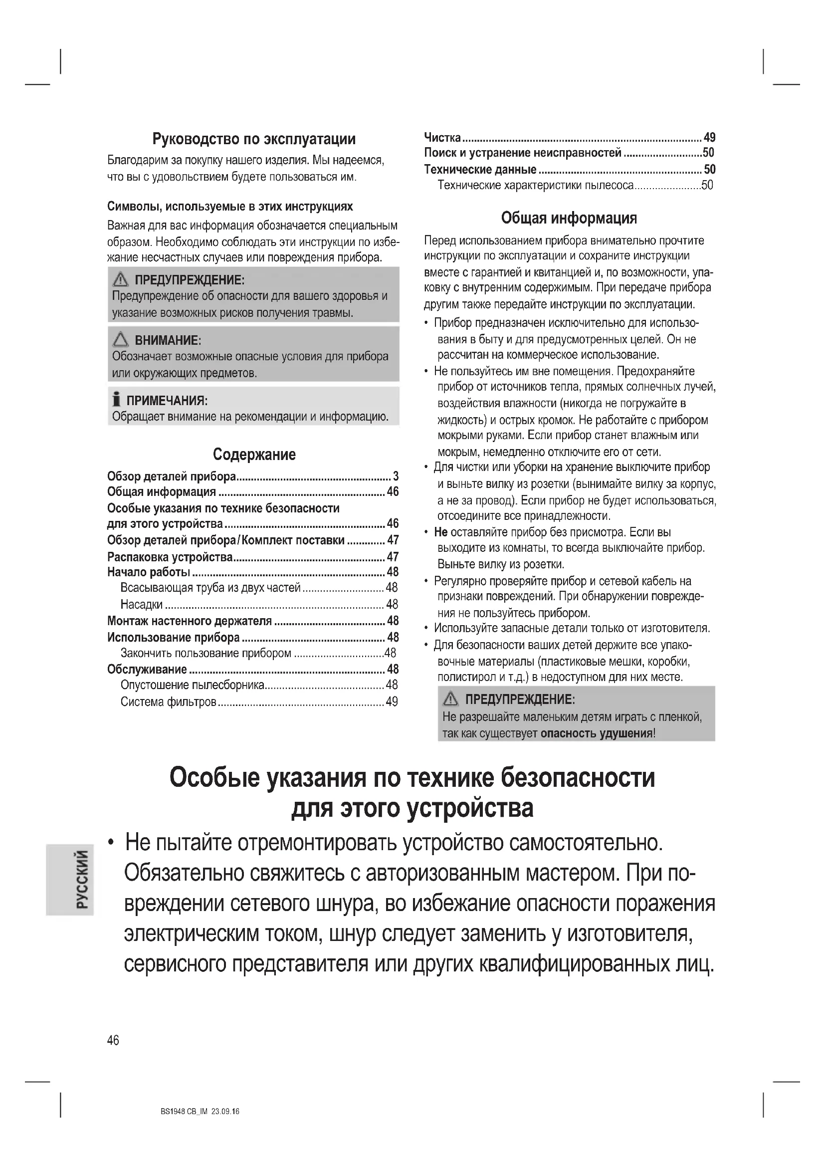 - Не пытайте отремонтировать устройство самостоятельно. Обязательно свяжитесь с авторизованным мастером. При по- вреждении сетевого шнура, во избежание опасности поражения электрическим током, шнур следует заменить у изготовителя, сервисного представителя или других квалифицированных лиц.47 BS1948 CB_IM 23.09.16
