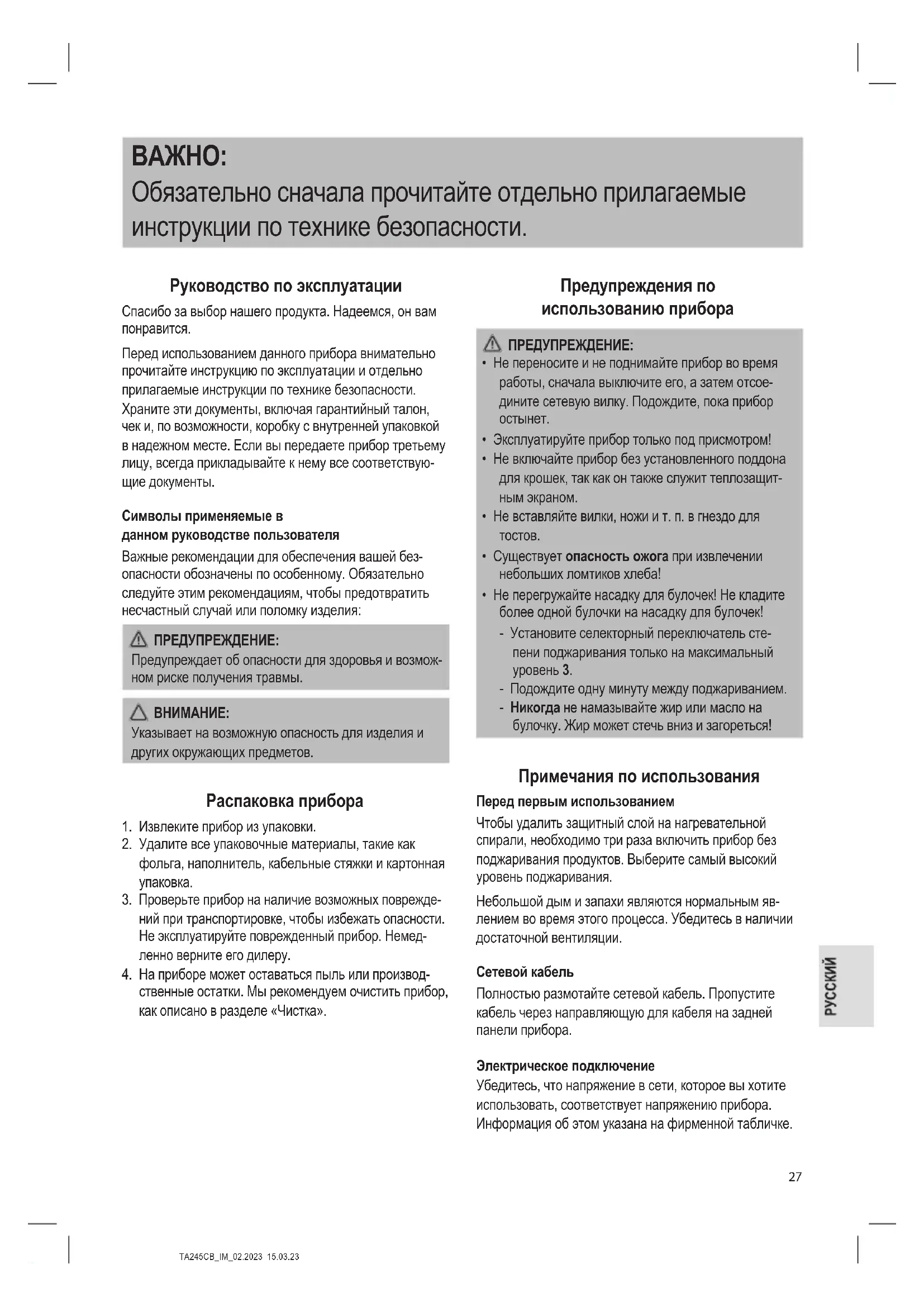 - Не перегружайте насадку для булочек! Не кладите более одной булочки на насадку для булочек! - Установите селекторный переключатель сте- пени поджаривания только на максимальный уровень 3. - Подождите одну минуту между поджариванием. - Никогда не намазывайте жир или масло на булочку. Жир может стечь вниз и загореться! Примечания по использования Перед первым использованием Чтобы удалить защитный слой на нагревательной спирали, необходимо три раза включить прибор без поджаривания продуктов. Выберите самый высокий уровень поджаривания. Небольшой дым и запахи являются нормальным яв- лением во время этого процесса. Убедитесь в наличии достаточной вентиляции. Сетевой кабель Полностью размотайте сетевой кабель. Пропустите кабель через направляющую для кабеля на задней панели прибора. Электрическое подключение Убедитесь, что напряжение в сети, которое вы хотите использовать, соответствует напряжению прибора. Информация об этом указана на фирменной табличке.TA245CB_IM_02.2023 15.03.23