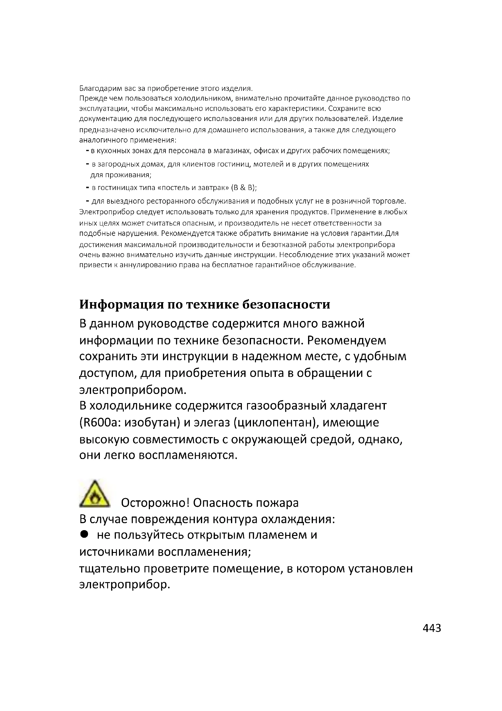 - Соответствие 43 Благодарим вас за приобретение этого изделия. Прежде чем пользоваться холодильником, внимательно прочитайте данное руководство по эксплуатации, чтобы максимально использовать его характеристики. Сохраните всю документацию для последующего использования или для других пользователей. Изделие предназначено исключительно для домашнего использования, а также для следующего аналогичного применения: - в кухонных зонах для персонала в магазинах, офисах и других рабочих помещениях; - в загородных домах, для клиентов гостиниц, мотелей и в других помещениях для проживания; - в гостиницах типа «постель и завтрак» (B & B); - для выездного ресторанного обслуживания и подобных услуг не в розничной торговле. Электроприбор следует использовать только для хранения продуктов. Применение в любых иных целях может считаться опасным, и производитель не несет ответственности за подобные нарушения. Рекомендуется также обратить внимание на условия гарантии. Для достижения максимальной производительности и безотказной работы электроприбора очень важно внимательно изучить данные инструкции. Несоблюдение этих указаний может привести к аннулированию права на бесплатное гарантийное обслуживание. Информация по технике безопасности В данном руководстве содержится много важной информации по технике безопасности. Рекомендуем сохранить эти инструкции в надежном месте, с удобным доступом, для приобретения опыта в обращении с электроприбором. В холодильнике содержится газообразный хладагент (R600a: изобутан) и элегаз (циклопентан), имеющие высокую совместимость с окружающей средой, однако, они легко воспламеняются. Осторожно! Опасность пожара В случае повреждения контура охлаждения: не пользуйтесь открытым пламенем и источниками воспламенения; тщательно проветрите помещение, в котором установлен электроприбор.444 p. 4634
