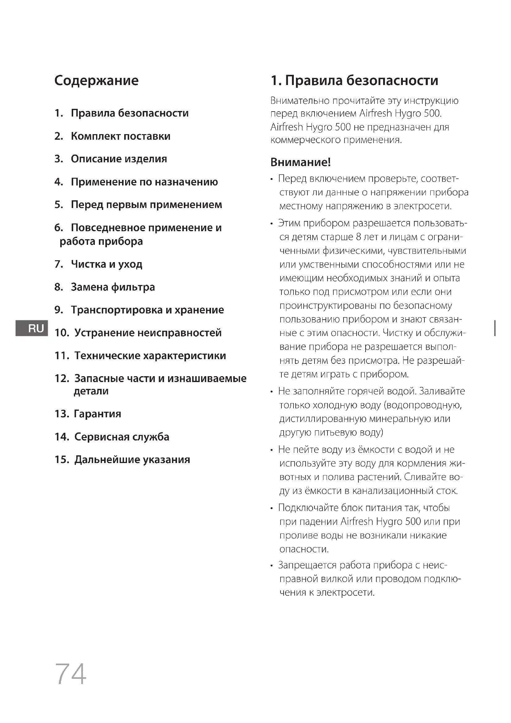 - Запрещается работа прибора с неис- правной вилкой или проводом подклю- чения к электросети. RU75